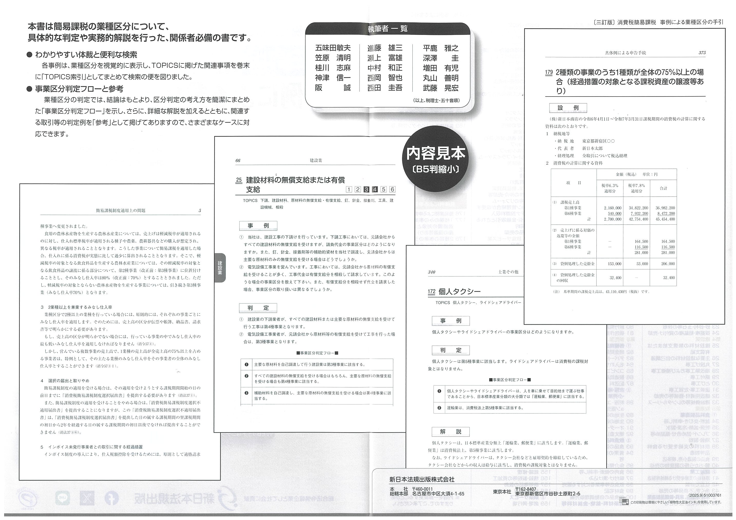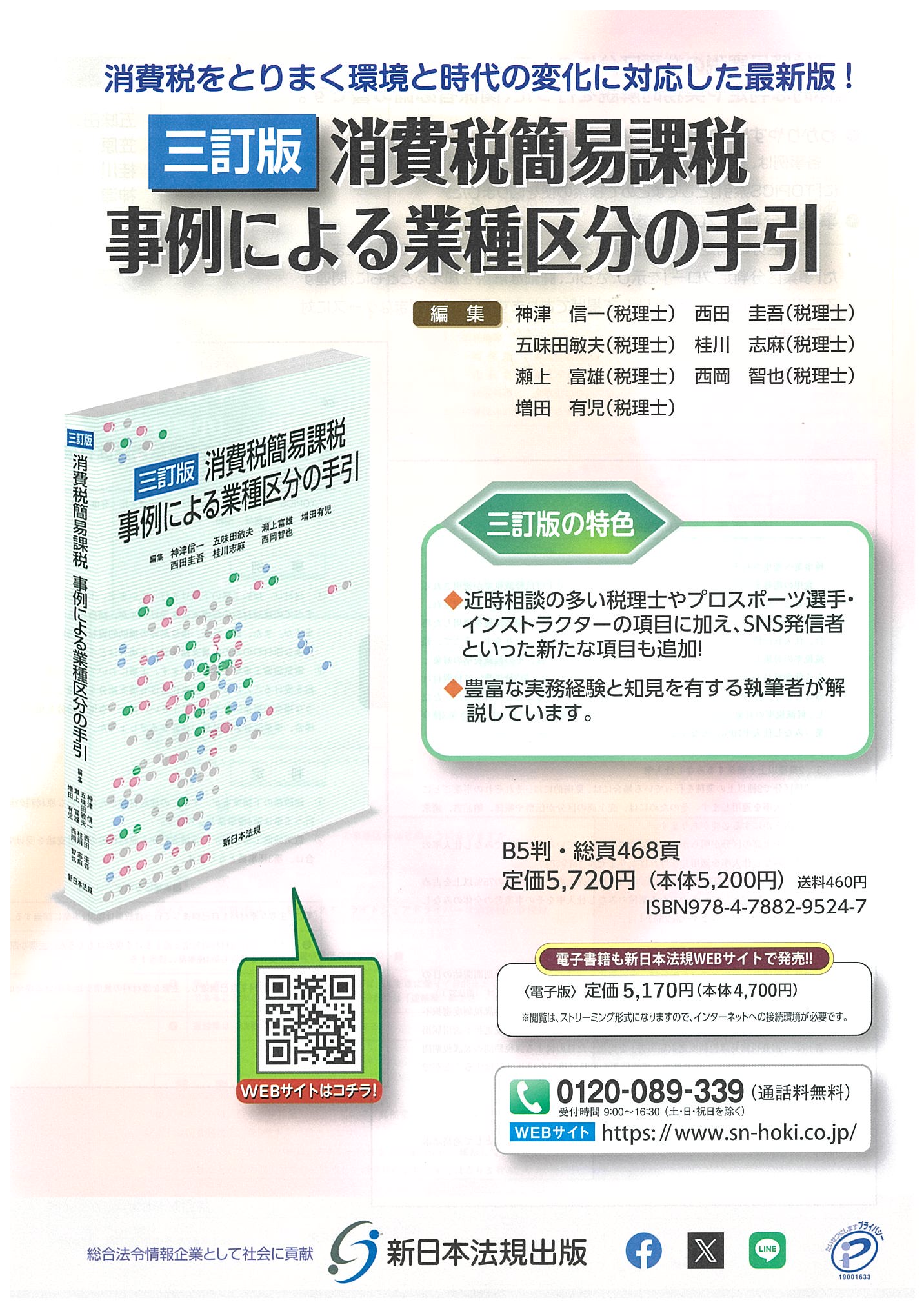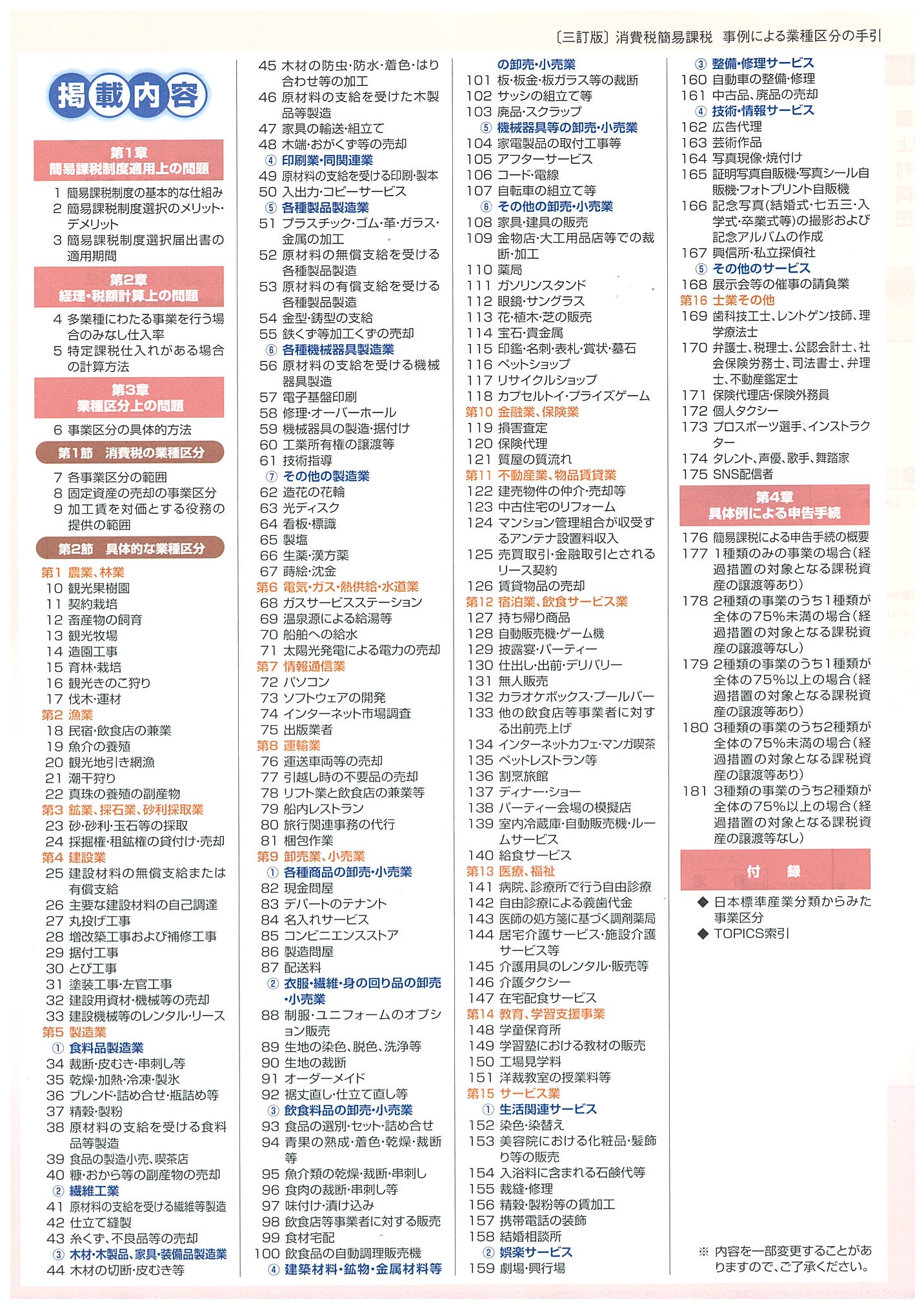 [三訂版]消費税簡易課税 事例による業種区分の手引 出版社:新日本法規出版 株式会社 登録情報 著者: 編集 神津信一(税理士)、五味田敏夫(税理士)、瀬上富雄(税理士)、増田有児(税理士)、西田圭吾(税理士)、桂川志麻(税理士)、西岡智也(税理士) 出版社: 新日本法規出版 株式会社 ISBN: 978-4-7882-9524-7 発刊日: 2025-10-08 定価 ¥5,720 (税込) 1 2 3 4 5 6 7 8 9 10 11 12 13 14 15 16 17 18 19 20 21 22 23 24 25 26 27 28 29 30 31 32 33 34 35 36 37 38 39 40 42 43 44 45 46 47 48 49 50 51 52 53 54 55 56 57 58 59 60 61 62 63 64 65 66 67 68 69 70 カートに入れる 商品の紹介 消費税をとりまく環境と時代の変化に対応した最新版!《三訂版の特色》◆近時相談の多い税理士やプロスポーツ選手・インストラクターの項目に加え、SNS発信者といった新たな項目も追加!◆豊富な実務経験と知見を有する執筆者が解説しています。本書は簡易課税の業種区分について、具体的な判定や実務的解説を行った、関係者必備の書です。◆わかりやすい体裁と便利な検索各事例は、業種区分を視覚的に表示し、TOPICSに掲げた関連事項を巻末に「TOPICS索引」としてまとめて検索の便を図りました。◆事業区分判定フローと参考業種区分の判定では、結論はもとより、区分判定の考え方を簡潔にまとめた「事業区分判定フロー」を示し、さらに、詳細な解説を加えるとともに、関連する取引等の判定例を「参考」として掲げてありますので、さまざまなケースに対応できます。 商品のキャンセル及び返品について ご注文が確定してからのキャンセル及び商品到着後の返品は原則不可とさせていただいております。 クーポンの利用忘れや注文の間違いには十分ご注意ください。 落丁・破損等があった場合については、各書籍の出版社までご連絡ください。 お支払い商品の・発送方法について 購入された書籍は、出版社ごとに請求書を同封して発送いたします。 異なる出版社の書籍を複数同時に購入された場合は、それぞれの出版社から別々の荷物で発送されます。 代金のお支払いは出版社ごとの請求書にてそれぞれお支払いください。