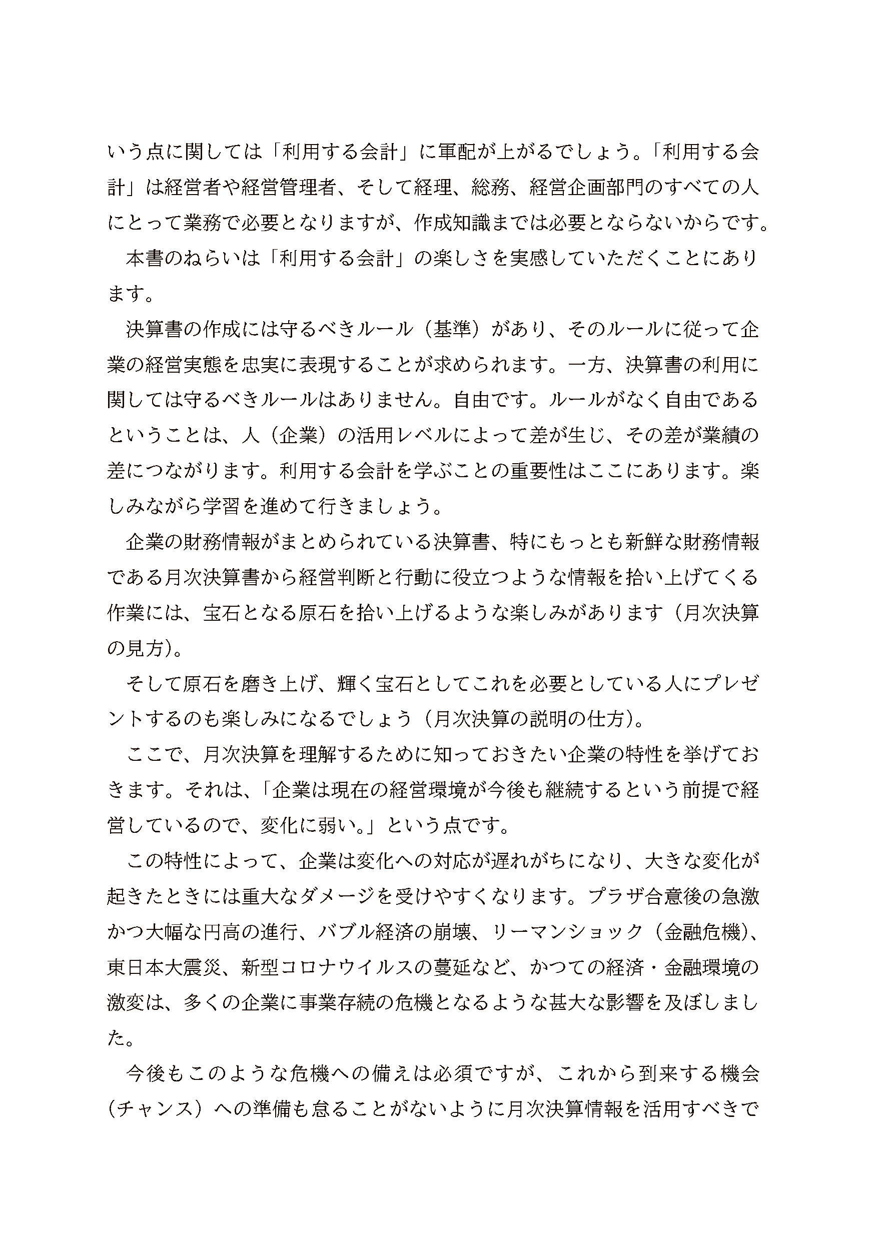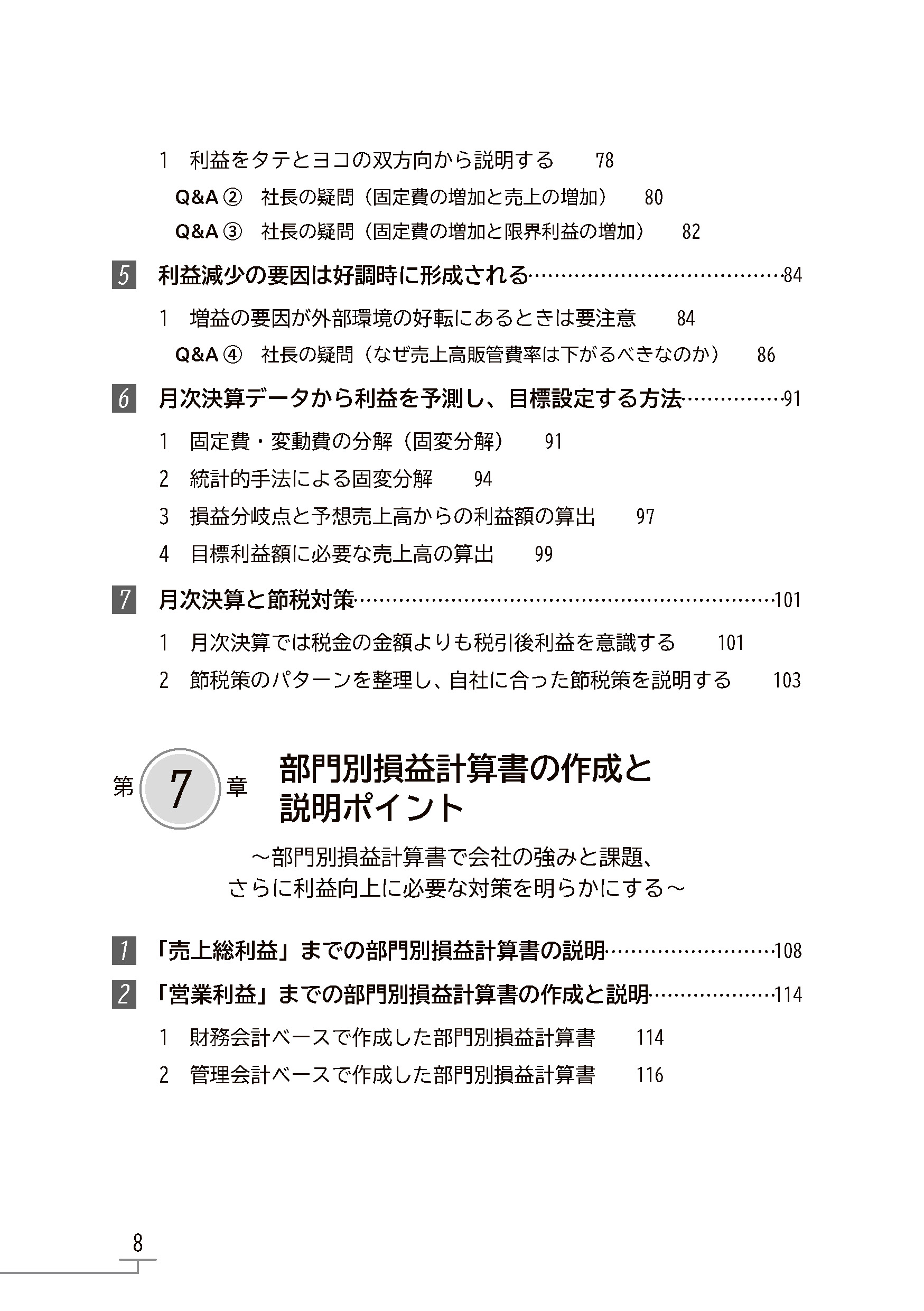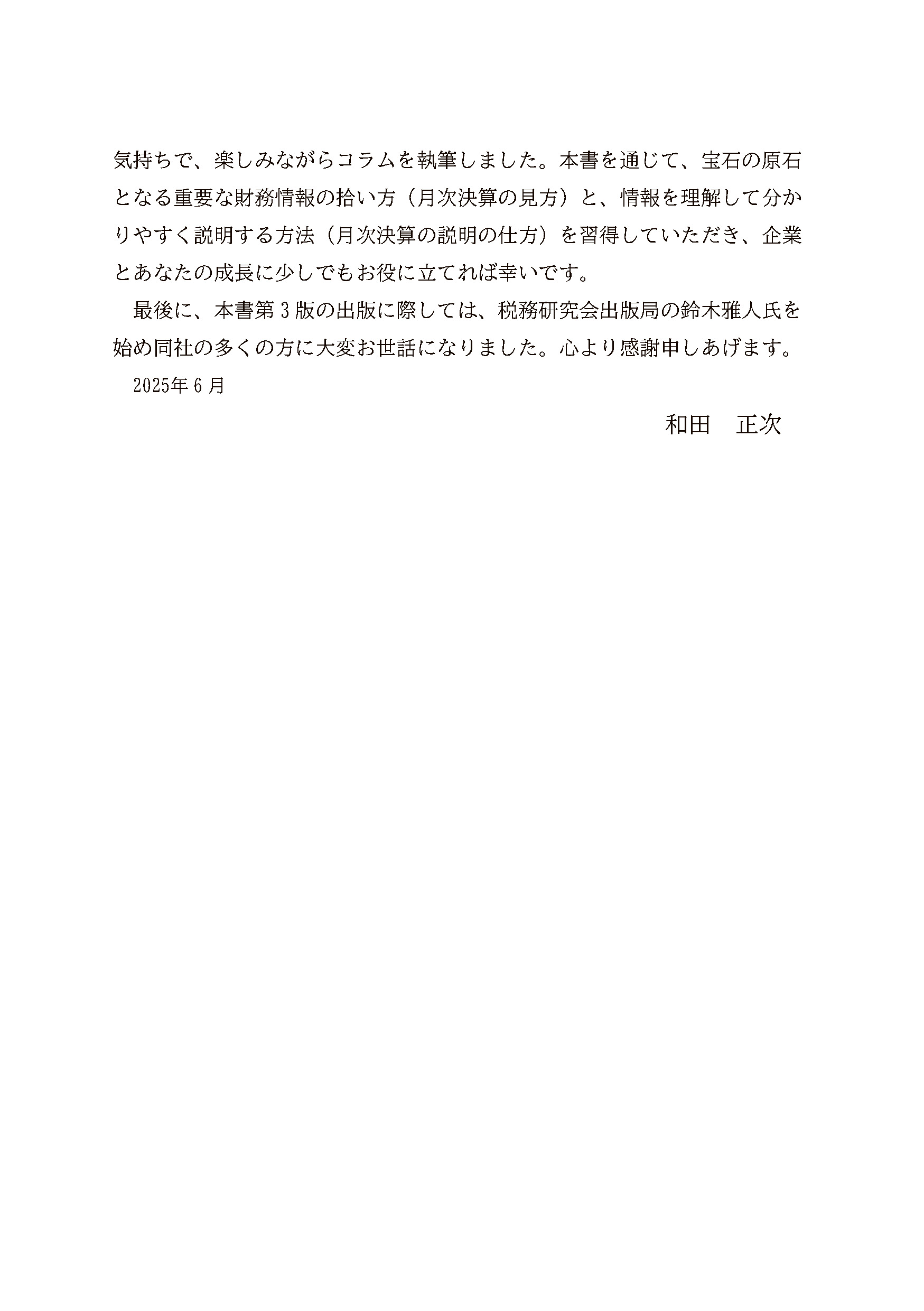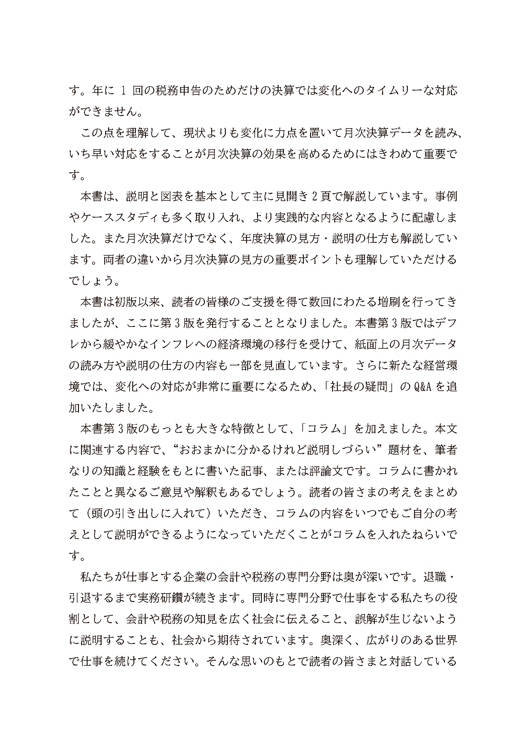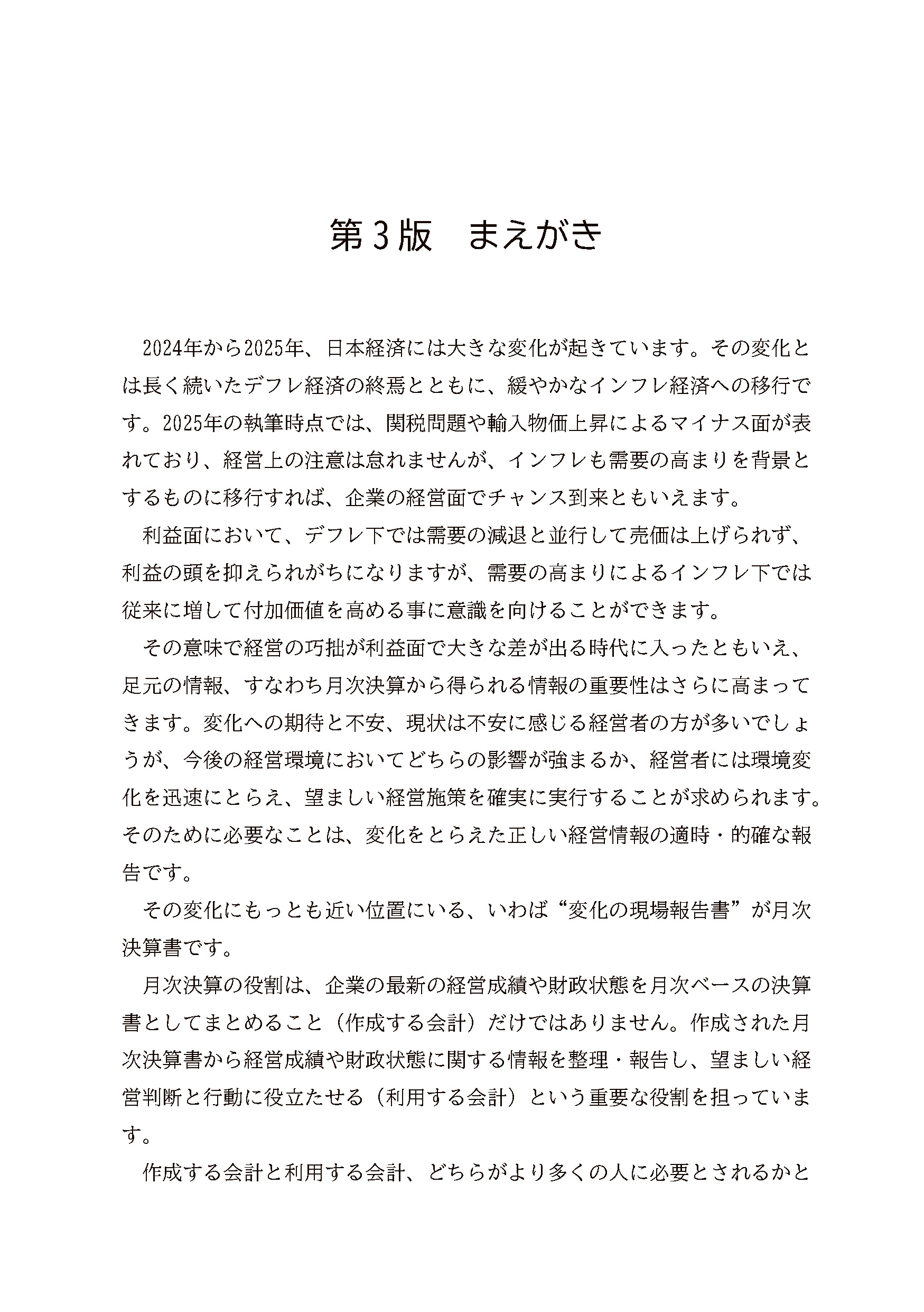 【第3版】実践理解 経理、総務、経営企画部門担当者のための月次決算書の見方・説明の仕方 出版社:株式会社 税務研究会 登録情報 著者: 和田正次 著 出版社: 株式会社 税務研究会 ISBN: 978-4-7931-2835-6 発刊日: 2025-09-04 定価 ¥3,080 (税込) 1 2 3 4 5 6 7 8 9 10 11 12 13 14 15 16 17 18 19 20 21 22 23 24 25 26 27 28 29 30 31 32 33 34 35 36 37 38 39 40 42 43 44 45 46 47 48 49 50 51 52 53 54 55 56 57 58 59 60 61 62 63 64 65 66 67 68 69 70 カートに入れる 商品の紹介 ◆月次決算には、企業の最新の経営成績や財政状態を月次ベースの決算書としてまとめるだけでなく、作成された月次決算書から経営成績や財政状態に関する情報を整理・報告し、望ましい経営判断と行動に役立たせるという重要な役割があります。◆本書は、単なる月次決算書の作り方といったテーマとは一線を画し、月次決算から企業に内在する問題解析能力、経営幹部への報告能力、改善のための提案力を身につけることができるように構成されています。◆月次決算をテーマにした解説した数少ない書籍として、主に見開き2ページで分かりやすく解説しており、事例やケース・スタディ、Q&Aを多く取り入れることで、より実践的な内容となっています。◆第3版では、本書の理解を深めるのに役立つ書き下ろしコラムを多数追加。そのほか、全編を通して我が国の経済情勢の変化を反映した内容に細かくアップデートしており、誌面デザインも一新しました。第2版までを手に取った方にも新鮮にお読みいただけます。 商品のキャンセル及び返品について ご注文が確定してからのキャンセル及び商品到着後の返品は原則不可とさせていただいております。 クーポンの利用忘れや注文の間違いには十分ご注意ください。 落丁・破損等があった場合については、各書籍の出版社までご連絡ください。 お支払い商品の・発送方法について 購入された書籍は、出版社ごとに請求書を同封して発送いたします。 異なる出版社の書籍を複数同時に購入された場合は、それぞれの出版社から別々の荷物で発送されます。 代金のお支払いは出版社ごとの請求書にてそれぞれお支払いください。