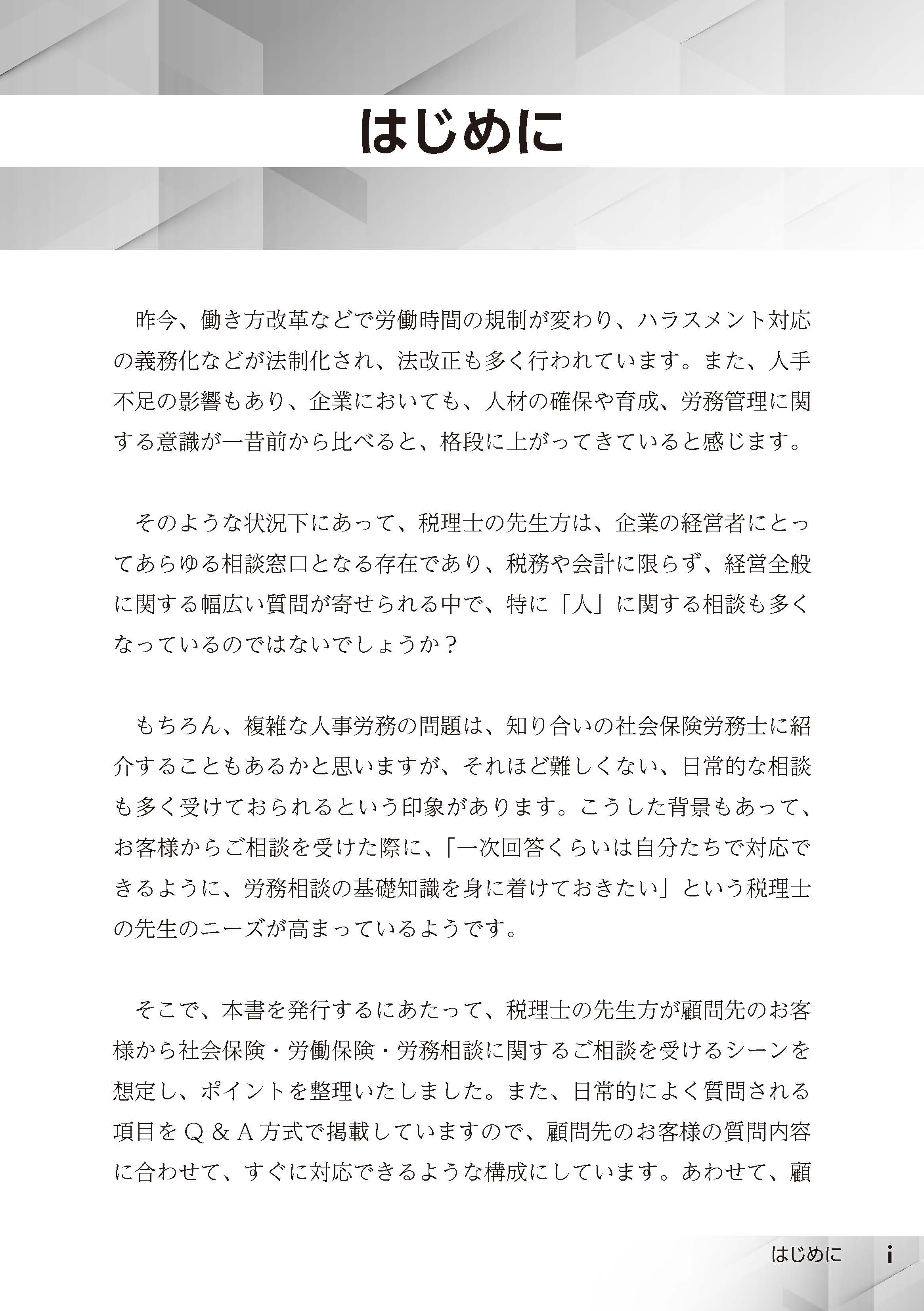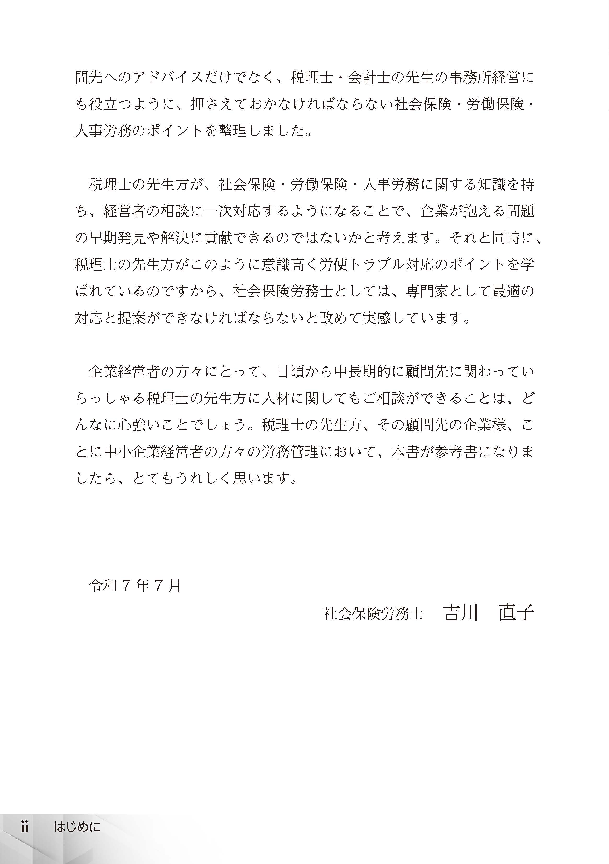 税理士必携 トラブルにならないための社会保険と労務の知識 出版社:株式会社 税務研究会 登録情報 著者: 吉川直子 著 出版社: 株式会社 税務研究会 ISBN: 978-4-7931-2870-7 発刊日: 2025-09-22 定価 ¥2,420 (税込) 1 2 3 4 5 6 7 8 9 10 11 12 13 14 15 16 17 18 19 20 21 22 23 24 25 26 27 28 29 30 31 32 33 34 35 36 37 38 39 40 42 43 44 45 46 47 48 49 50 51 52 53 54 55 56 57 58 59 60 61 62 63 64 65 66 67 68 69 70 カートに入れる 商品の紹介 【税理士・会計士の日々の業務に役立つ社会保険・労基法の知識から働き方や労務管理に関するトラブル対応までを、ぎゅっと集約した一冊!】昨今、働き方改革などで労働時間の規制が変わり、ハラスメント対応の義務化などが法制化されるなど、改正も多く行われています。また、人手不足の影響もあり、企業においても、人材の確保や育成、労務管理に関する意識が一昔前から比べると、格段に上がってきています。本書は、税理士の先生方が、顧問先のお客様から社会保険・労働保険・労務に関するご相談を受けるシーンを想定して作成し、昨今の改正の流れや解雇・退職にまつわる労務トラブルの防止などポイントを整理しました。社会保険の適用拡大による「106万円の壁」の撤廃を含む年金改正法などの最新情報についても解説しています。また、「兼務役員はどうなる?」「副業にどう対応する?」「契約終了か雇止めか?」「注意しただけなのにパワハラと言われたら?」「退職した従業員から未払い残業代を請求されたら?」など、迷いやすい事例を30のQ&Aで解説しています。税理士の先生方が、社会保険・労働保険・人事労務に関する知識を持ち、経営者・管理部門等の皆さまからのご相談に、一次対応できるようになるための必読書です。先生方の事務所経営においても、役立てていただきたい1冊です。 商品のキャンセル及び返品について ご注文が確定してからのキャンセル及び商品到着後の返品は原則不可とさせていただいております。 クーポンの利用忘れや注文の間違いには十分ご注意ください。 落丁・破損等があった場合については、各書籍の出版社までご連絡ください。 お支払い商品の・発送方法について 購入された書籍は、出版社ごとに請求書を同封して発送いたします。 異なる出版社の書籍を複数同時に購入された場合は、それぞれの出版社から別々の荷物で発送されます。 代金のお支払いは出版社ごとの請求書にてそれぞれお支払いください。
