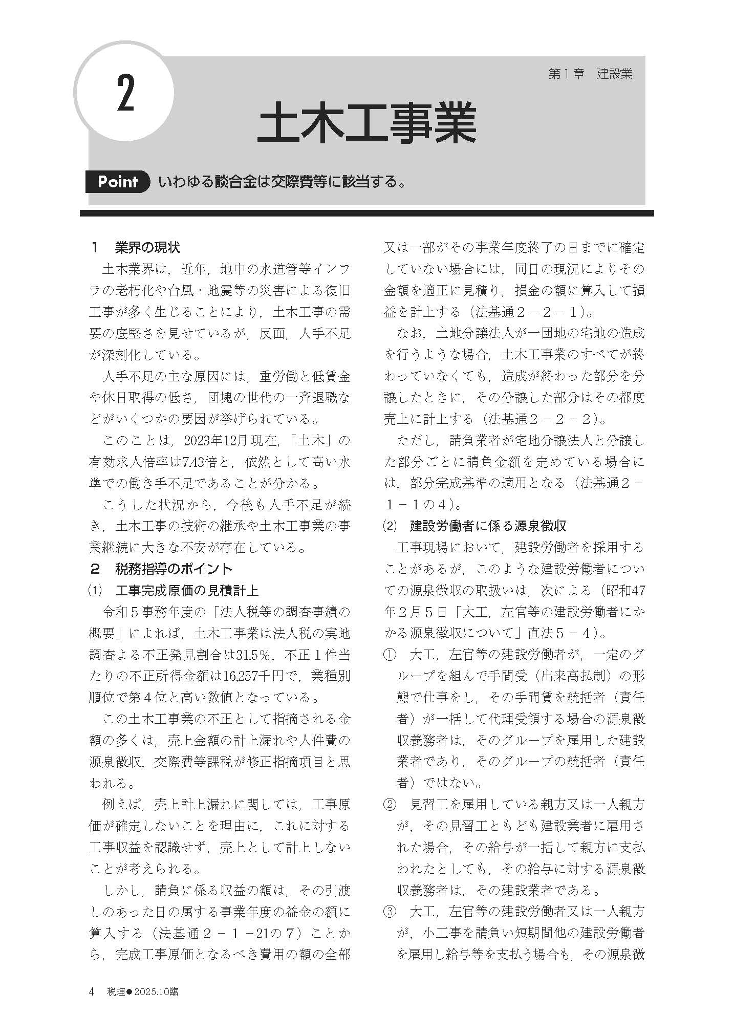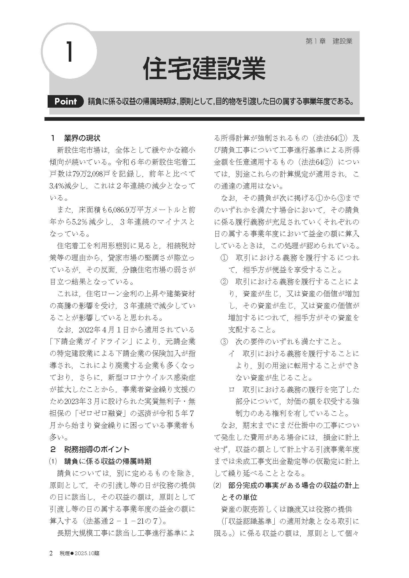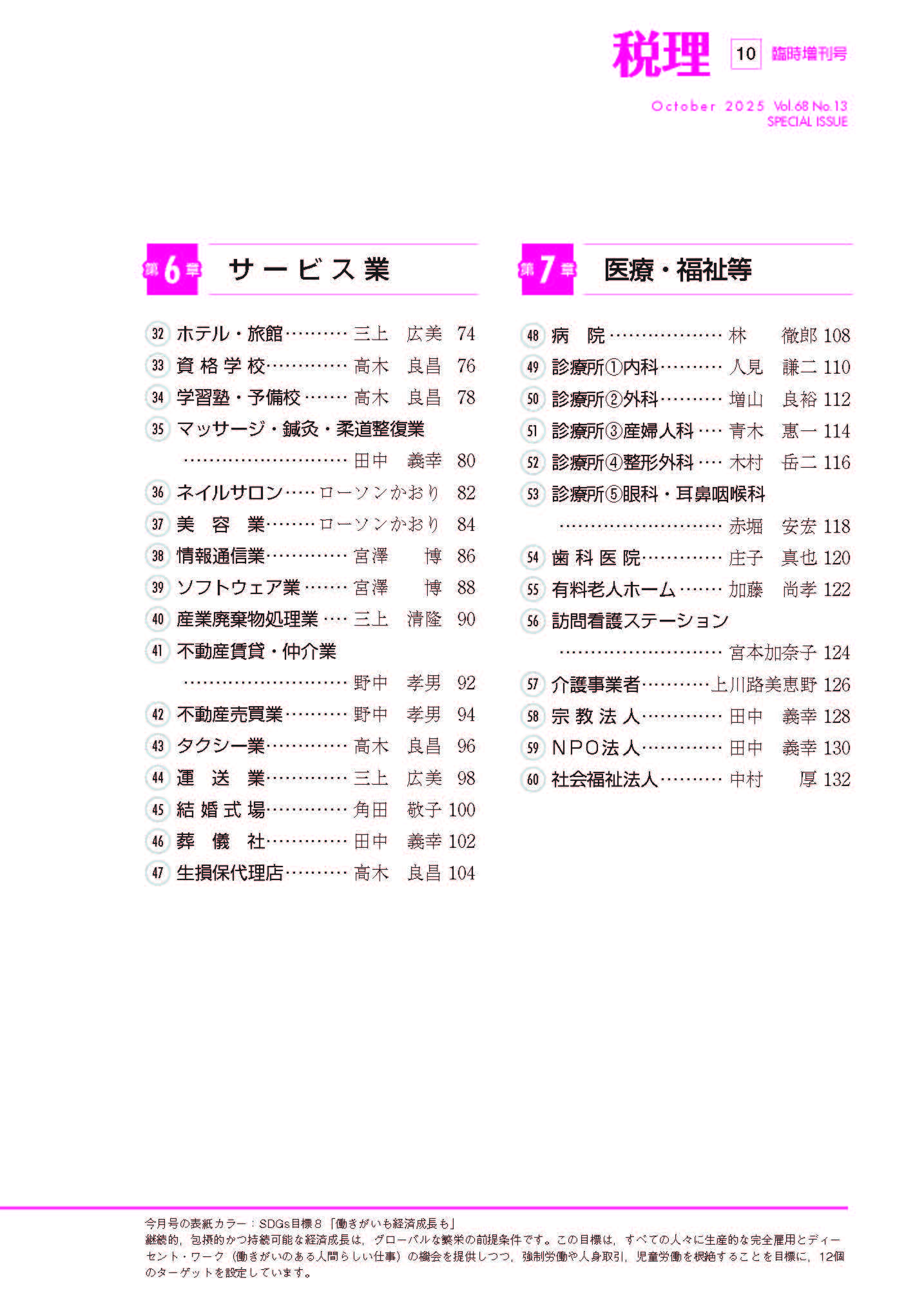 月刊 税理 2025年10月臨時増刊号 業務別税務ハンドブック 出版社:株式会社 ぎょうせい 登録情報 著者: 日本税理士会連合会/監修 出版社: 株式会社 ぎょうせい ISBN: 978-4-324-00025-0 発刊日: 2025-10-24 定価 ¥2,420 (税込) 1 2 3 4 5 6 7 8 9 10 11 12 13 14 15 16 17 18 19 20 21 22 23 24 25 26 27 28 29 30 31 32 33 34 35 36 37 38 39 40 42 43 44 45 46 47 48 49 50 51 52 53 54 55 56 57 58 59 60 61 62 63 64 65 66 67 68 69 70 カートに入れる 商品の紹介 業種別税務ハンドブック税理士はさまざまな業種に関与しているが、各業種における経理慣行や税務の取扱いはそれぞれ微妙に異なっている。それゆえ税理士は、それぞれの業種に適した会計・税務処理の方法をよく理解し、実務に当たらなければならない。そこで本臨時増刊号では、日本標準産業分類をもとに60業種を取り上げ、各業種の現状や特徴、最近のトピックス、特有の税務のポイント・注意点などについて、見開き2ページでコンパクトに解説。税理士が初めてその業種に関与する際、まずその業種の特徴をインプットするための資料として最適。第1章 建設業1 住宅建設業2 土木工事業3 住宅リフォーム業第2章 製造業4 食料品製造業5 繊維工業6 製材業7 電気機械器具製造業8 自動車部品製造業第3章 農業・漁業9 米作農業10 野菜農業11 酪農業12 海面漁業第4章 卸・小売業13 コンビニエンスストア14 洋菓子・和菓子店15 書店16 酒販店17 家具店18 紳士服店19 婦人服・子供服店20 調剤薬局21 建材・木材店22 自転車店23 ガソリンスタンド24 文具店第5章 卸・小売業25 中華料理店26 そば,うどん店27 日本料理店28 レストラン29 焼肉店30 バー・スナック31 喫茶店第6章 サービス業32 ホテル・旅館33 資格学校34 学習塾・予備校35 マッサージ・鍼灸・柔道整復業36 ネイルサロン37 美容業38 情報通信業39 ソフトウェア業40 産業廃棄物処理業41 不動産賃貸・仲介業42 不動産売買業43 タクシー業44 運送業45 結婚式場46 葬儀社47 生損保代理店第7章 医療・福祉等48 病院49 診療所①内科50 診療所②外科51 診療所③産婦人科52 診療所④整形外科53 診療所⑤眼科・耳鼻咽喉科54 歯科医院55 有料老人ホーム56 訪問看護ステーション57 介護事業者58 宗教法人59 NPO法人60 社会福祉法人 商品のキャンセル及び返品について ご注文が確定してからのキャンセル及び商品到着後の返品は原則不可とさせていただいております。 クーポンの利用忘れや注文の間違いには十分ご注意ください。 落丁・破損等があった場合については、各書籍の出版社までご連絡ください。 お支払い商品の・発送方法について 購入された書籍は、出版社ごとに請求書を同封して発送いたします。 異なる出版社の書籍を複数同時に購入された場合は、それぞれの出版社から別々の荷物で発送されます。 代金のお支払いは出版社ごとの請求書にてそれぞれお支払いください。