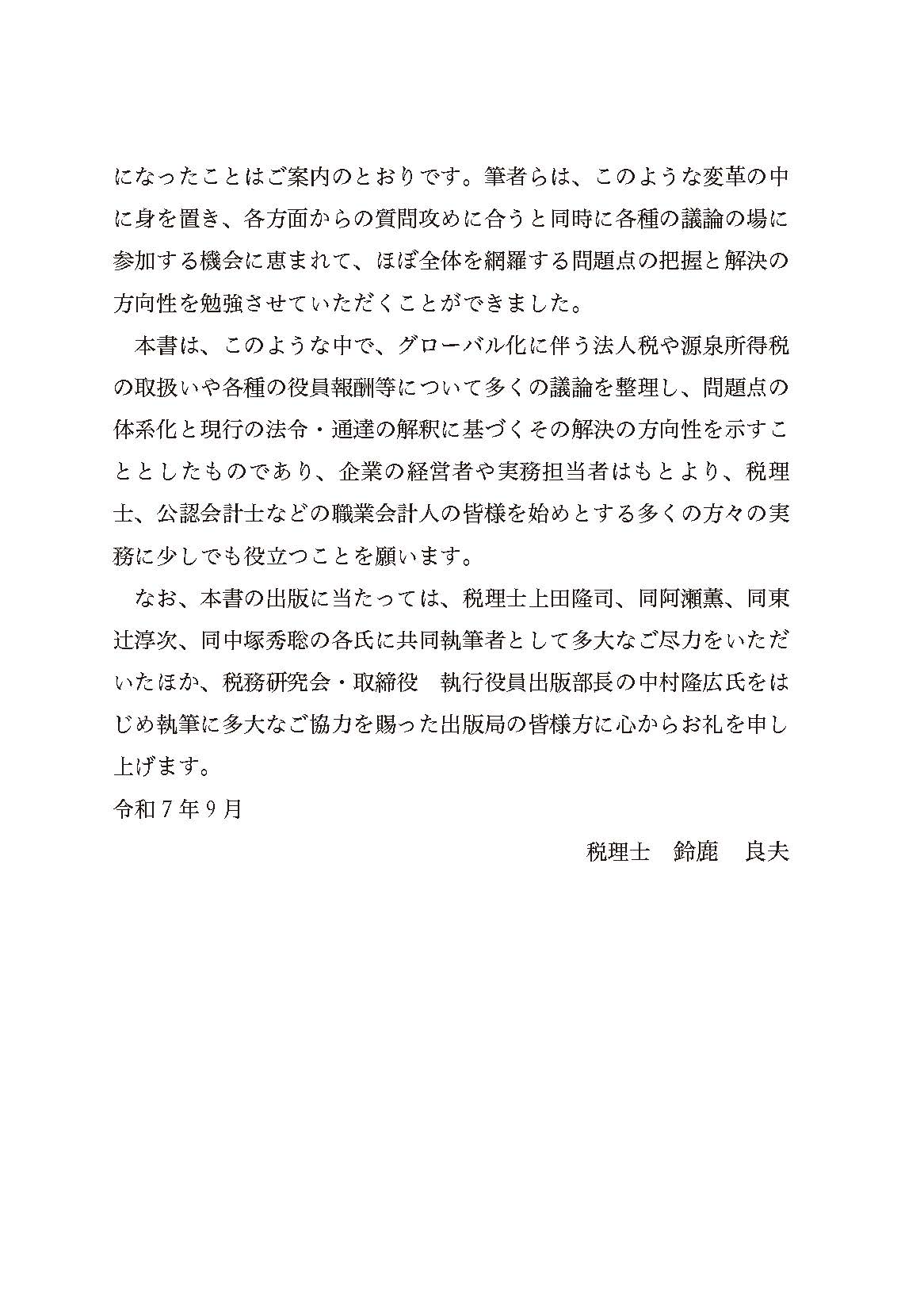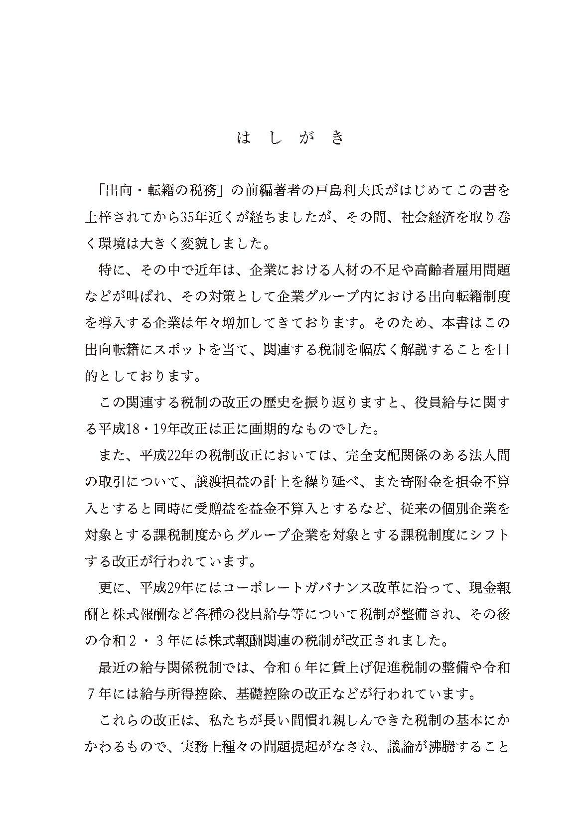 六訂版 出向・転籍の税務 出版社:株式会社 税務研究会 登録情報 著者: 鈴鹿良夫 編著 出版社: 株式会社 税務研究会 ISBN: 978-4-7931-2893-6 発刊日: 2025-10-12 定価 ¥5,500 (税込) 1 2 3 4 5 6 7 8 9 10 11 12 13 14 15 16 17 18 19 20 21 22 23 24 25 26 27 28 29 30 31 32 33 34 35 36 37 38 39 40 42 43 44 45 46 47 48 49 50 51 52 53 54 55 56 57 58 59 60 61 62 63 64 65 66 67 68 69 70 カートに入れる 商品の紹介 〇本書は、ますます複雑になる企業の出向・転籍に関する法人税、源泉所得税の取扱いを体系的、網羅的に解説した書籍です。〇出向や転籍をめぐる法人税、源泉所得税及び消費税の基本的な取扱いに加え、グループ企業間での出向や転籍、海外勤務者をめぐる税務、各種の役員報酬等の取扱いについて整理し、その解決の方向性を示しています。〇六訂版では、令和3年の短期退職手当等に係る退職所得の金額の計算の見直し、令和6年の賃上げ促進税制の整備や令和7年の給与所得控除、基礎控除の改正など、五訂版発行後の改正事項を織り込んだうえで、最新の質疑応答事例を多数追加しました。 商品のキャンセル及び返品について ご注文が確定してからのキャンセル及び商品到着後の返品は原則不可とさせていただいております。 クーポンの利用忘れや注文の間違いには十分ご注意ください。 落丁・破損等があった場合については、各書籍の出版社までご連絡ください。 お支払い商品の・発送方法について 購入された書籍は、出版社ごとに請求書を同封して発送いたします。 異なる出版社の書籍を複数同時に購入された場合は、それぞれの出版社から別々の荷物で発送されます。 代金のお支払いは出版社ごとの請求書にてそれぞれお支払いください。