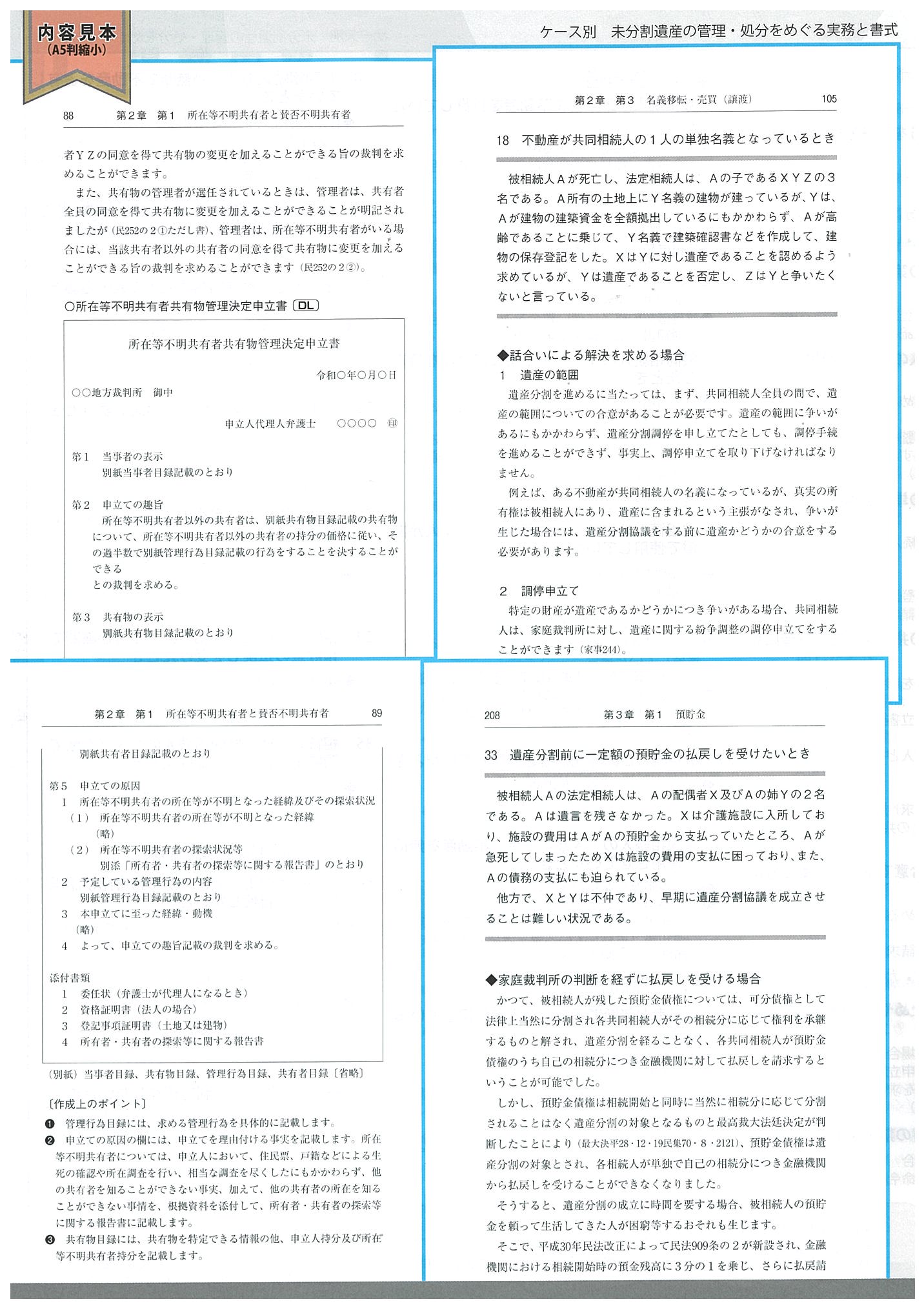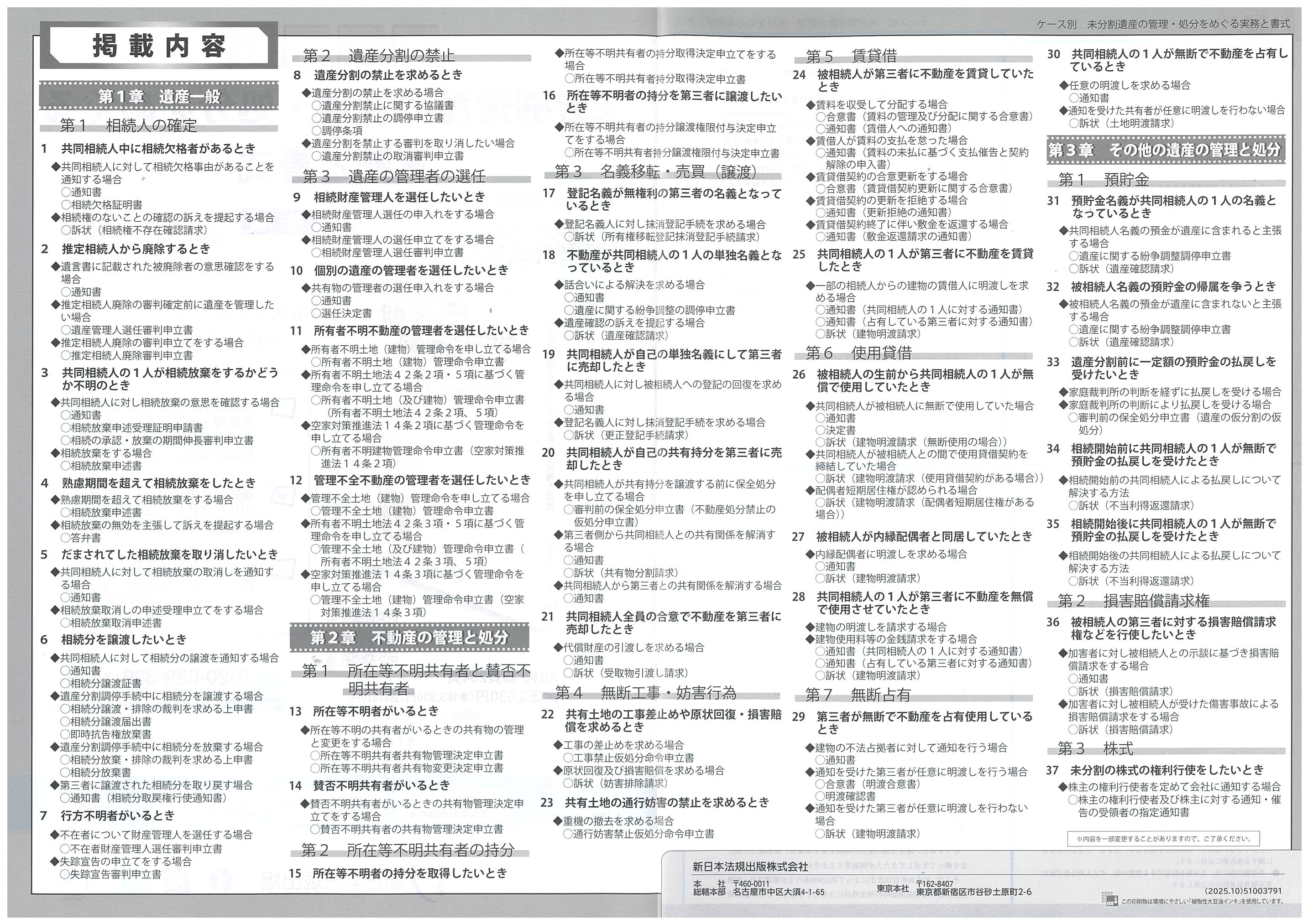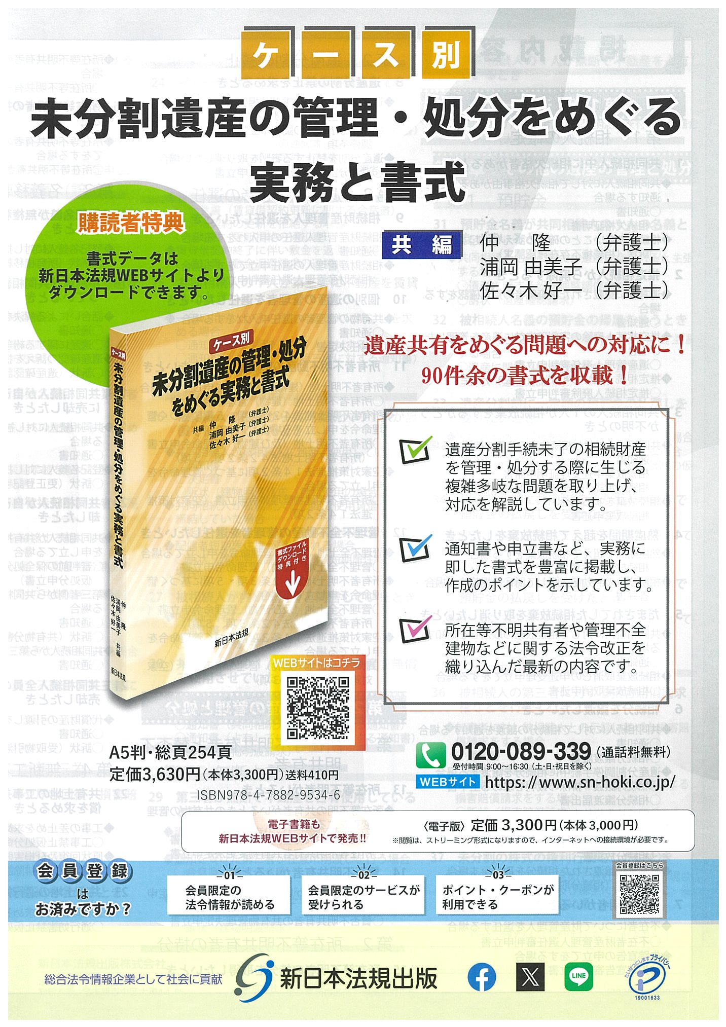 ケース別 未分割遺産の管理・処分をめぐる実務と書式 出版社:新日本法規出版 株式会社 登録情報 著者: 共編 仲隆(弁護士)、浦岡由美子(弁護士)、佐々木好一(弁護士) 出版社: 新日本法規出版 株式会社 ISBN: 978-4-7882-9534-6 発刊日: 2025-10-28 定価 ¥3,630 (税込) 1 2 3 4 5 6 7 8 9 10 11 12 13 14 15 16 17 18 19 20 21 22 23 24 25 26 27 28 29 30 31 32 33 34 35 36 37 38 39 40 42 43 44 45 46 47 48 49 50 51 52 53 54 55 56 57 58 59 60 61 62 63 64 65 66 67 68 69 70 カートに入れる 商品の紹介 遺産共有をめぐる問題への対応に!90件余の書式を収載!◆遺産分割手続未了の相続財産を管理・処分する際に生じる複雑多岐な問題を取り上げ、対応を解説しています。◆通知書や申立書など、実務に即した書式を豊富に掲載し、作成のポイントを示しています。◆所在等不明共有者や管理不全建物などに関する法令改正を織り込んだ最新の内容です。 商品のキャンセル及び返品について ご注文が確定してからのキャンセル及び商品到着後の返品は原則不可とさせていただいております。 クーポンの利用忘れや注文の間違いには十分ご注意ください。 落丁・破損等があった場合については、各書籍の出版社までご連絡ください。 お支払い商品の・発送方法について 購入された書籍は、出版社ごとに請求書を同封して発送いたします。 異なる出版社の書籍を複数同時に購入された場合は、それぞれの出版社から別々の荷物で発送されます。 代金のお支払いは出版社ごとの請求書にてそれぞれお支払いください。