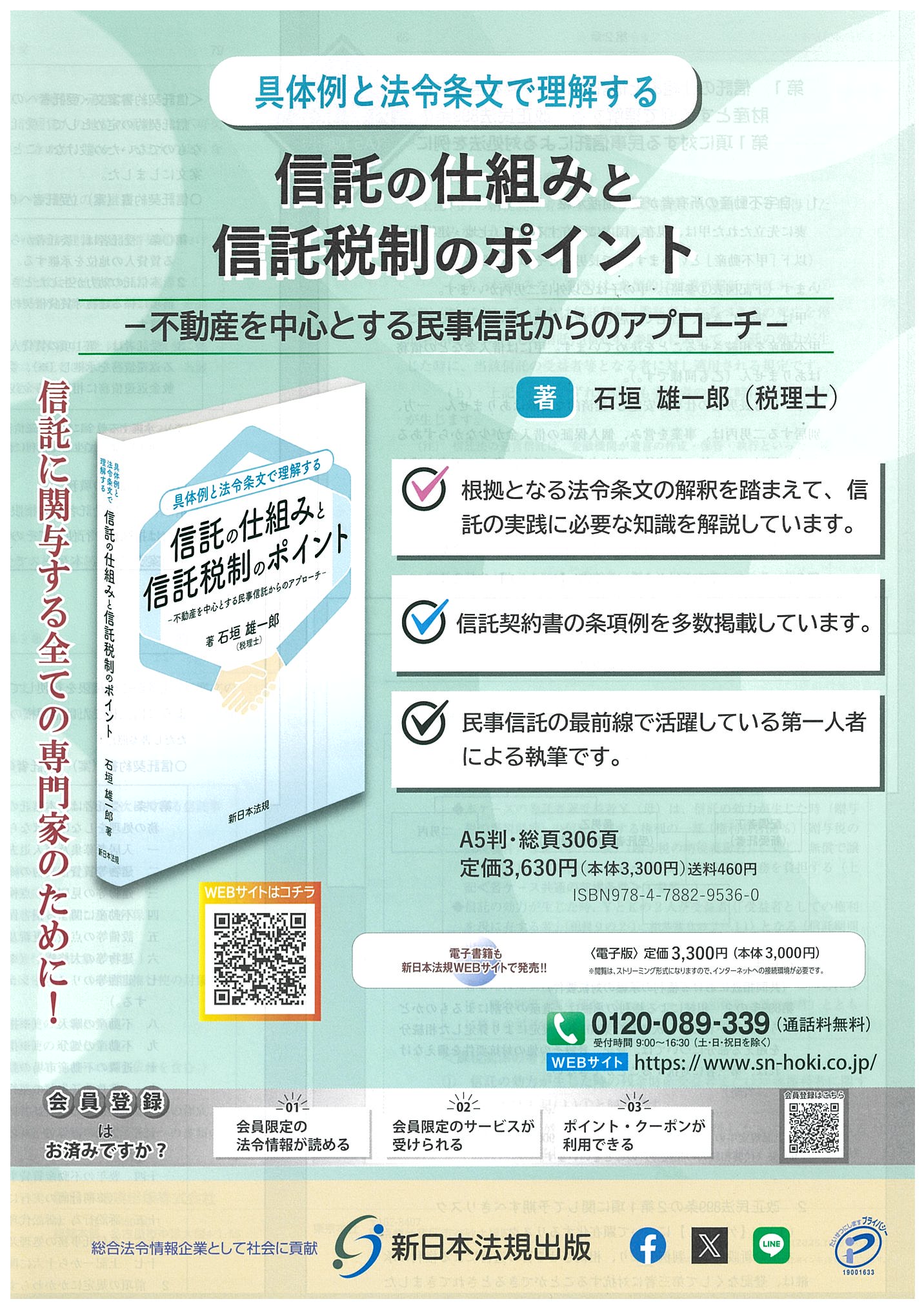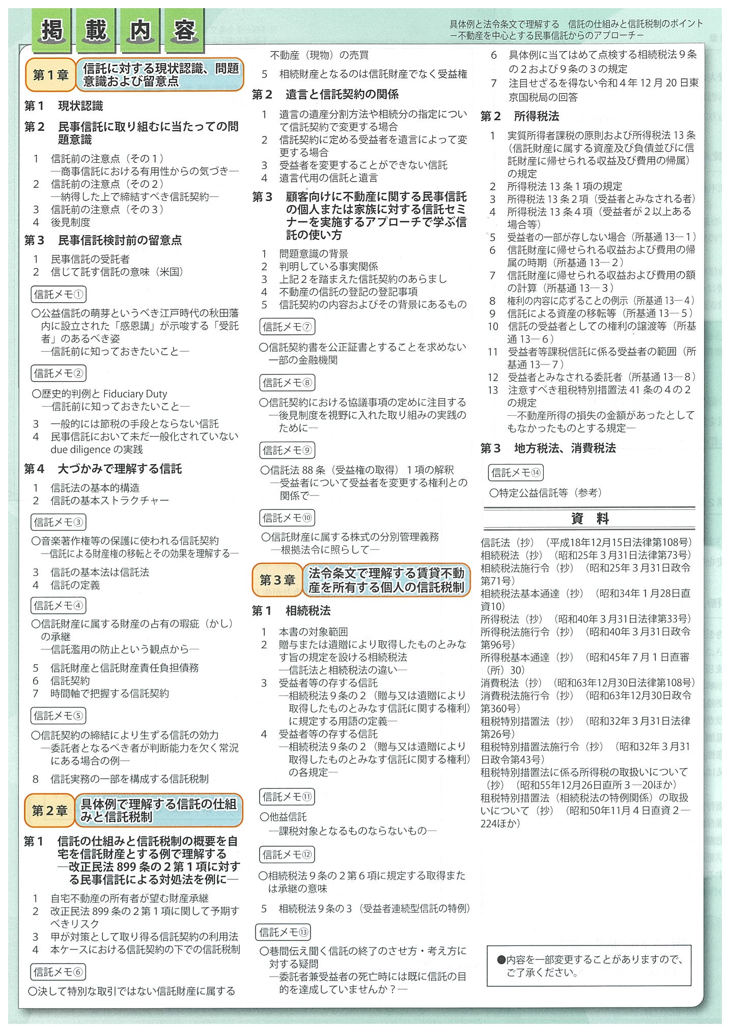 具体例と法令条文で理解する 信託の仕組みと信託税制のポイント- 不動産を中心とする民事信託からのアプローチ- 出版社:新日本法規出版 株式会社 登録情報 著者: 著 石垣雄一郎(税理士) 出版社: 新日本法規出版 株式会社 ISBN: 978-4-7882-9536-0 発刊日: 2025-11-17 定価 ¥3,630 (税込) 1 2 3 4 5 6 7 8 9 10 11 12 13 14 15 16 17 18 19 20 21 22 23 24 25 26 27 28 29 30 31 32 33 34 35 36 37 38 39 40 42 43 44 45 46 47 48 49 50 51 52 53 54 55 56 57 58 59 60 61 62 63 64 65 66 67 68 69 70 カートに入れる 商品の紹介 信託に関与する全ての専門家のために!◆根拠となる法令条文の解釈を踏まえて、信託の実践に必要な知識を解説しています。◆信託契約書の条項例を多数掲載しています。◆民事信託の最前線で活躍している第一人者による執筆です。 商品のキャンセル及び返品について ご注文が確定してからのキャンセル及び商品到着後の返品は原則不可とさせていただいております。 クーポンの利用忘れや注文の間違いには十分ご注意ください。 落丁・破損等があった場合については、各書籍の出版社までご連絡ください。 お支払い商品の・発送方法について 購入された書籍は、出版社ごとに請求書を同封して発送いたします。 異なる出版社の書籍を複数同時に購入された場合は、それぞれの出版社から別々の荷物で発送されます。 代金のお支払いは出版社ごとの請求書にてそれぞれお支払いください。