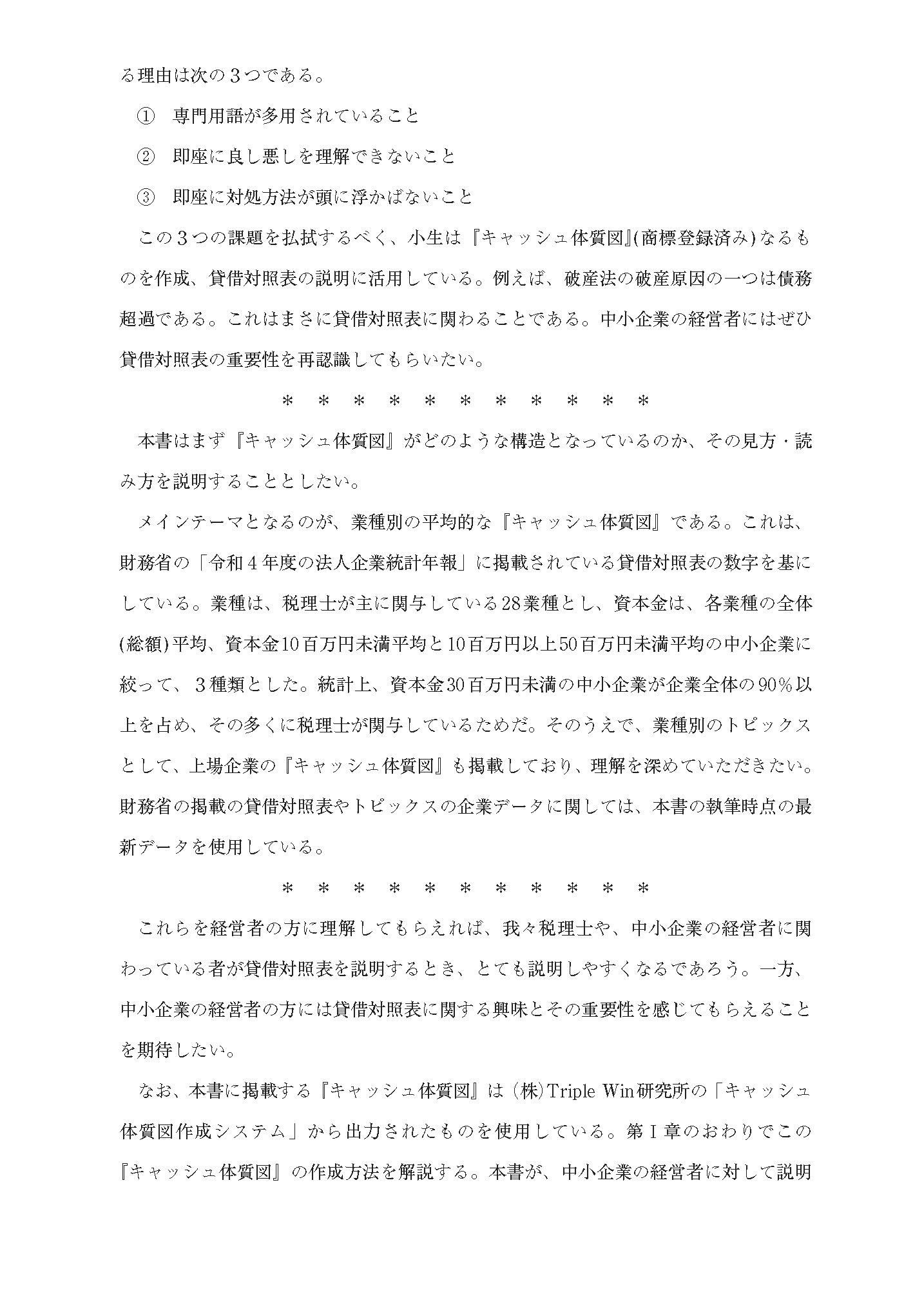バランスシートが直感で読める!!業種別 会社の経営体力診断 出版社:株式会社 ぎょうせい 登録情報 著者: 堀江 國明/著 出版社: 株式会社 ぎょうせい ISBN: 978-4-324-11576-3 発刊日: 2025-11-30 定価 ¥3,410 (税込) 1 2 3 4 5 6 7 8 9 10 11 12 13 14 15 16 17 18 19 20 21 22 23 24 25 26 27 28 29 30 31 32 33 34 35 36 37 38 39 40 42 43 44 45 46 47 48 49 50 51 52 53 54 55 56 57 58 59 60 61 62 63 64 65 66 67 68 69 70 カートに入れる 商品の紹介 関与先の 資金体質※ を素早く診断経営体力 向上のアドバイスができるようになる!!※バランスシート(貸借対照表)を加工した『キャッシュ体質図』(商標登録)により、資金に余剰がある“キャッシュリッチ”か資金が不足する“キャッシュプア”を診断【本書のポイント】◆1◆会計用語を使わずにバランスシートからみた改善点を説明できる!! 【第Ⅰ章】例:悪玉資産・脂肪資産を減らして「現金等」を増やす 悪玉資産…1年以内に現金化できる売掛金等 脂肪資産…土地や建物などの固定資産◆2◆有名企業100数社を診断 【第Ⅲ章】有価証券報告書を開示する大手企業のバランスシートのデータと、資本金5000万円未満の中小企業の平均データ【第Ⅱ章】を徹底比較!!◆3◆業種別は製造業・サービス業などを28業種に細分化 【第Ⅲ章】税理士の関与先に当てはまる業種が見つかる!!<目次>第Ⅰ章 会社の経営体力がわかる『キャッシュ体質図』1 キャッシュ体質図とは2 具体的なケースでわかるキャッシュフロー計算書と『キャッシュ体質図』の関係3 キャッシュ体質図の見方・読み方4 運転資金の2要素と売上高の増減5 キャッシュ体質図の作り方第Ⅱ章 全産業・製造業・非製造業別『キャッシュ体質図』(平成・令和)1 全産業2 製造業3 非製造業第Ⅲ章 業種別 主要企業の経営体力診断食料品製造業/繊維工業/木材・木製品製造業/パルプ・紙・紙加工品製造業/印刷・同関連業/鉄鋼業/非鉄金属製造業/金属製品製造業/はん用機械器具製造業/生産用機械器具製造業/業務用機械器具製造業/電気機械器具製造業/情報通信機械器具製造業/その他の製造業/建設業/情報通信業/その他の運輸業/卸売業/小売業/不動産業/宿泊業/飲食サービス業/生活関連サービス業/娯楽業/医療・福祉業/教育・学習支援業/職業紹介・労働者派遣業/その他のサービス業 商品のキャンセル及び返品について ご注文が確定してからのキャンセル及び商品到着後の返品は原則不可とさせていただいております。 クーポンの利用忘れや注文の間違いには十分ご注意ください。 落丁・破損等があった場合については、各書籍の出版社までご連絡ください。 お支払い商品の・発送方法について 購入された書籍は、出版社ごとに請求書を同封して発送いたします。 異なる出版社の書籍を複数同時に購入された場合は、それぞれの出版社から別々の荷物で発送されます。 代金のお支払いは出版社ごとの請求書にてそれぞれお支払いください。