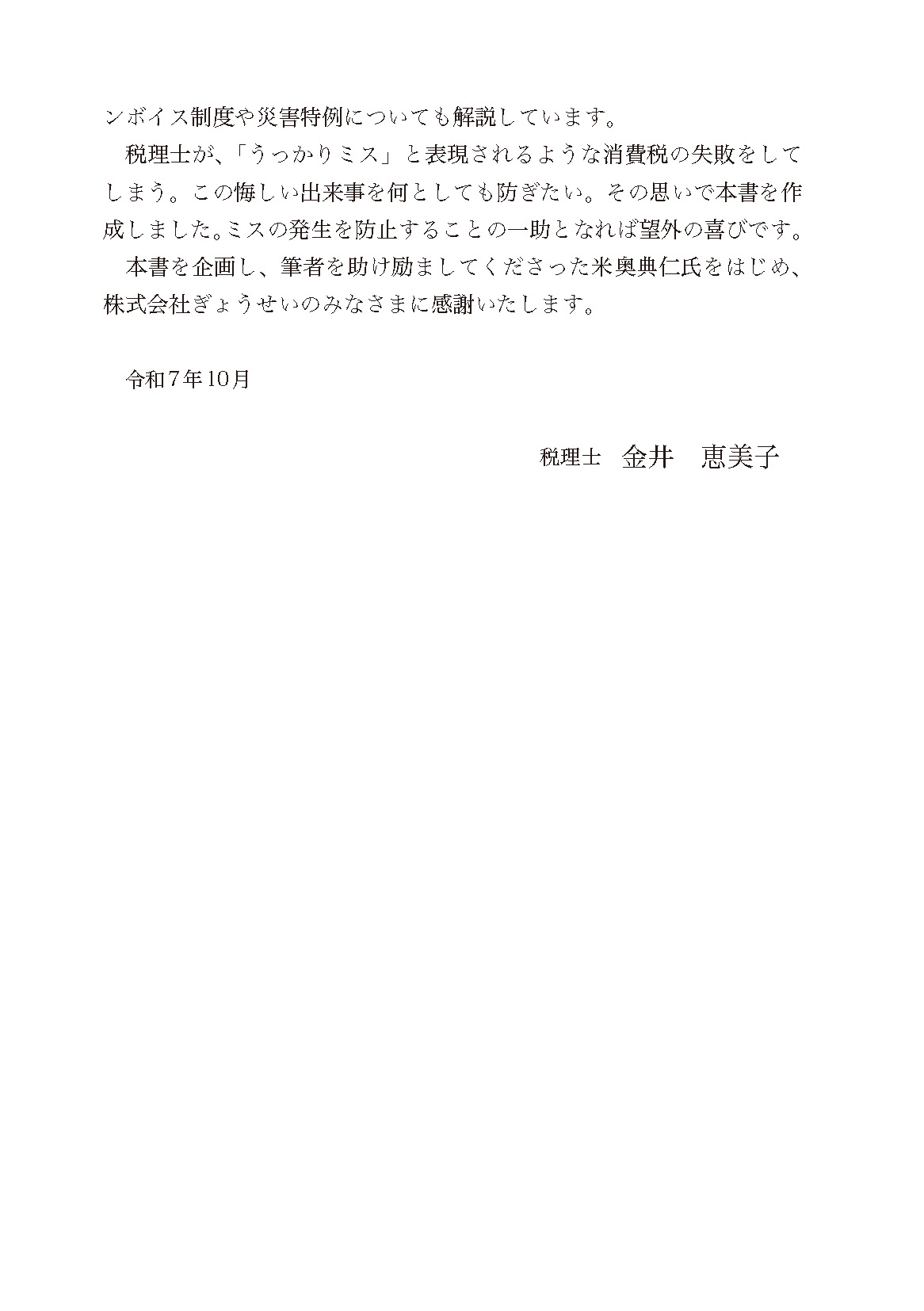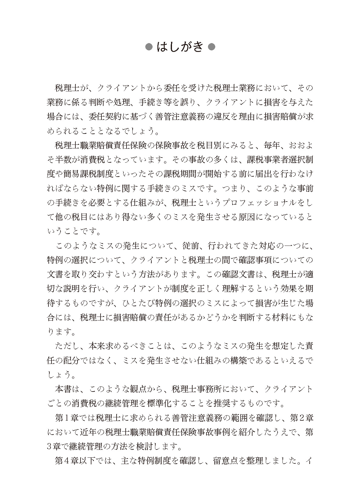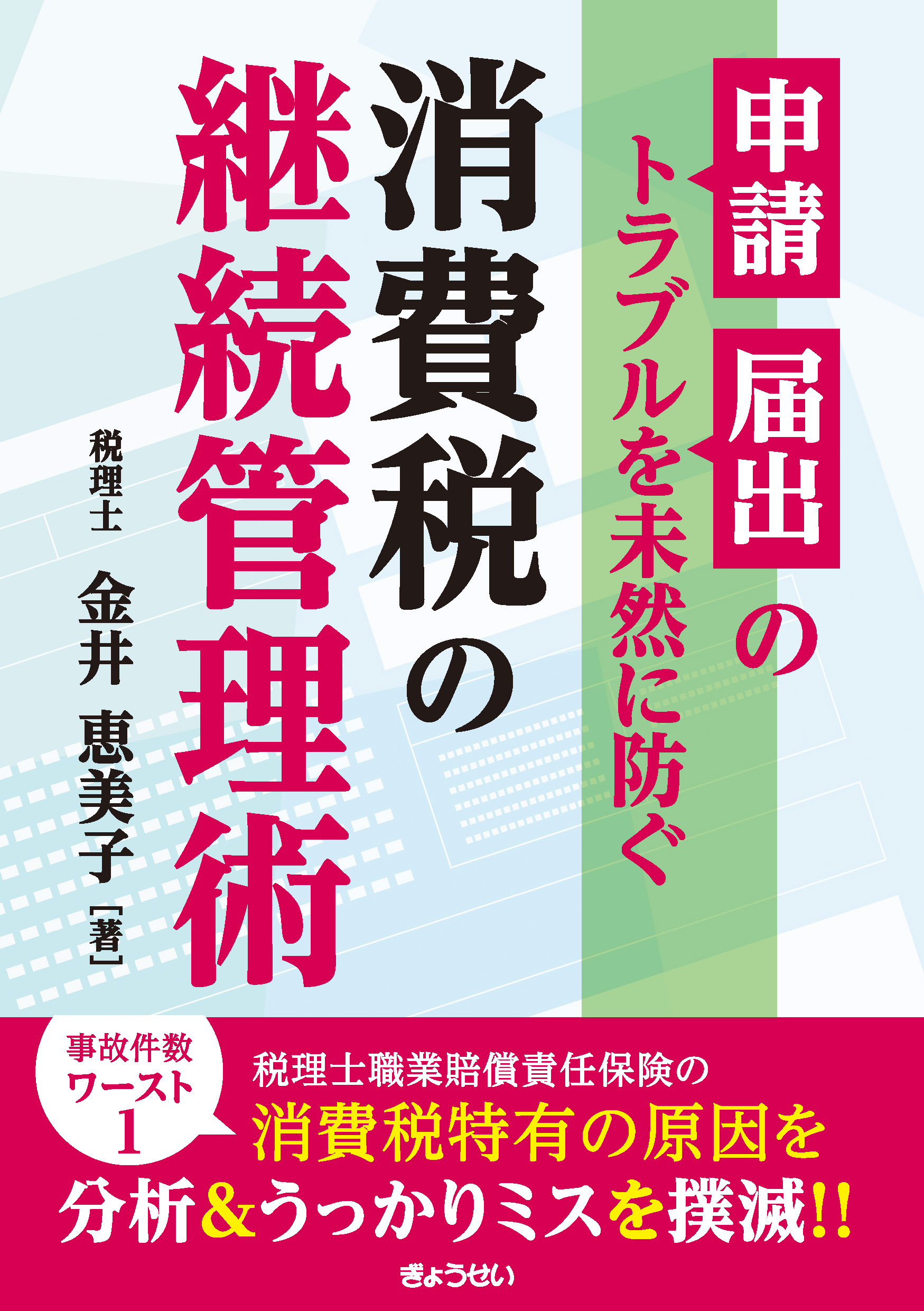 申請・届出のトラブルを未然に防ぐ消費税の継続管理術 出版社:株式会社 ぎょうせい 登録情報 著者: 金井 恵美子/著 出版社: 株式会社 ぎょうせい ISBN: 978-4-324-11580-0 発刊日: 2025-11-25 定価 ¥3,300 (税込) 1 2 3 4 5 6 7 8 9 10 11 12 13 14 15 16 17 18 19 20 21 22 23 24 25 26 27 28 29 30 31 32 33 34 35 36 37 38 39 40 42 43 44 45 46 47 48 49 50 51 52 53 54 55 56 57 58 59 60 61 62 63 64 65 66 67 68 69 70 カートに入れる 商品の紹介 増え続ける消費税の税賠事故の根本解決※ は“ミスを起こさない仕組み”づくり !!※税理士と関与先の【申請・届出に関する】確認文書は、ミスが起きた時、どちらに責任があるかを証明するのに役立つものだが、ミスそのものをなくすツールではない。本書は税理士のミスを撲滅する仕組みを提案します!!STEP1 税理士の善管注意義務の対象範囲? 裁判例等から税理士の責任範囲を明確化STEP2 税理士職業賠償責任保険の事故事例を徹底分析STEP3 【仕組み化?】特例選択の状況確認&継続管理? STEP1 & STEP2 の事故を起こさない確認&管理簿STEP4 【仕組み化?】届出・申請関係の手続を総チェック!!~事故事例だけではない届出・申請関係のトラブルの芽を事前に摘み取る!!<目次>第1章 税理士の業務に関する善管注意義務1 税理士の業務と責任2 税理士に求められる善管注意義務の範囲3 小括第2章 税理士職業賠償責任保険の事故事例1 保険金の支払い状況2 事故事例3 小括第3章 特例選択の状況確認と継続管理1 特例に係る事前届出2 日本税理士会連合会の提案3 現状の確認4 継続管理5 事務所内のカンファレンス第4章 届出・申請の留意点【届出書・申請書一覧】1 事業者免税点制度2 簡易課税制度3 個別対応方式における課税売上割合に準ずる割合4 課税期間の特例5 任意の中間申告6 個人事業者の申告期限の特例7 法人の申告期限の特例第5章 インボイス制度1 インボイス制度の趣旨と概要2 適格請求書発行事業者登録制度3 インボイス発行事業者の義務4 仕入税額控除の要件5 少額特例6 8割控除・5割控除(区分記載請求書等保存の経過措置)7 2割特例(小規模事業者に係る税額控除に関する経過措置)第6章 災害特例1 趣旨と概要2 特定非常災害の指定を受けた場合の特例3 簡易課税制度に係る災害特例4 やむを得ない事情がある場合の届出特例 商品のキャンセル及び返品について ご注文が確定してからのキャンセル及び商品到着後の返品は原則不可とさせていただいております。 クーポンの利用忘れや注文の間違いには十分ご注意ください。 落丁・破損等があった場合については、各書籍の出版社までご連絡ください。 お支払い商品の・発送方法について 購入された書籍は、出版社ごとに請求書を同封して発送いたします。 異なる出版社の書籍を複数同時に購入された場合は、それぞれの出版社から別々の荷物で発送されます。 代金のお支払いは出版社ごとの請求書にてそれぞれお支払いください。
