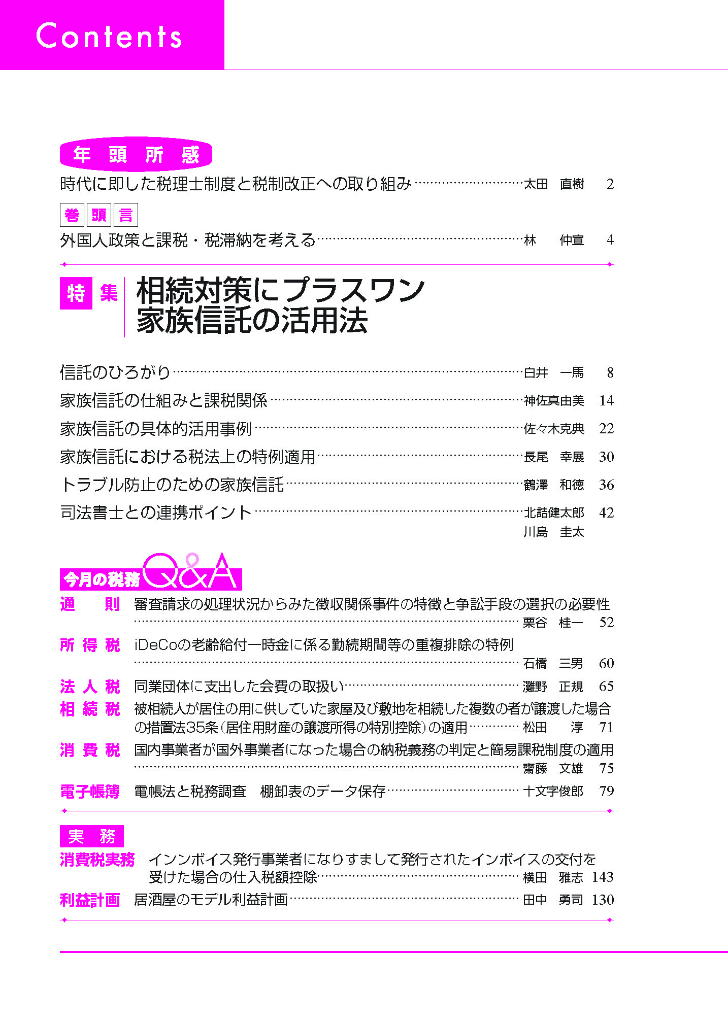 月刊 税理 2026年1月号 特集:相続対策にプラスワン 家族信託の活用 出版社:株式会社 ぎょうせい 登録情報 著者: 日本税理士会連合会/監修 出版社: 株式会社 ぎょうせい ISBN: 978-4-324-00029-0 発刊日: 2026-01-01 定価 ¥2,420 (税込) 1 2 3 4 5 6 7 8 9 10 11 12 13 14 15 16 17 18 19 20 21 22 23 24 25 26 27 28 29 30 31 32 33 34 35 36 37 38 39 40 42 43 44 45 46 47 48 49 50 51 52 53 54 55 56 57 58 59 60 61 62 63 64 65 66 67 68 69 70 カートに入れる 商品の紹介 特集:相続対策にプラスワン 家族信託の活用 高齢化社会の進展に伴い家族信託の需要は高まりをみせ,その利用動向を示すと言われている土地信託登記件数は,2023年では2万件を超え,直近5年で約2倍増加している。経営者の身近な相談役としての税理士に相談をするというケースもある。本特集では税理士が関与先などから相続の相談を受けた際に,家族信託も一つの選択肢として提案できるよう基本的な仕組み,課税関係,具体的な活用事例を紹介し解説する。信託のひろがり/税理士 白井 一馬家族信託の仕組みと課税関係/税理士 神佐真由美家族信託の具体的活用事例/税理士 佐々木克典家族信託における税法上の特例適用/税理士 長尾 幸展トラブル防止のための家族信託/税理士 鶴澤 和徳司法書士との連携ポイント /司法書士法人F&Partners 司法書士 北詰健太郎 司法書士 川島 圭太 今月の税務Q&A 通 則 審査請求の処理状況からみた徴収関係事件の特徴と争訟手段の選択の必要性/元東金税務 /署長 栗谷 桂一所 得 税 iDeCoの老齢給付一時金に係る勤続期間等の重複排除の特例 /税理士 石橋 三男法 人 税 同業団体等に支出した会費の取扱い /税理士 灘野 正規相 続 税 被相続人が居住の用に供していた家屋及び敷地を相続した複数の者が譲渡した場合の措置法35条(居住用財産の譲渡所得の特別控除)の適用 /税理士 松田 淳消 費 税 国内事業者が国外事業者になった場合の納税義務の判定と簡易課税制度の適用 /税理士 齋藤 文雄電子帳簿 電帳法と税務調査 棚卸表のデータ保存 /税理士 十文字俊郎 商品のキャンセル及び返品について ご注文が確定してからのキャンセル及び商品到着後の返品は原則不可とさせていただいております。 クーポンの利用忘れや注文の間違いには十分ご注意ください。 落丁・破損等があった場合については、各書籍の出版社までご連絡ください。 お支払い商品の・発送方法について 購入された書籍は、出版社ごとに請求書を同封して発送いたします。 異なる出版社の書籍を複数同時に購入された場合は、それぞれの出版社から別々の荷物で発送されます。 代金のお支払いは出版社ごとの請求書にてそれぞれお支払いください。