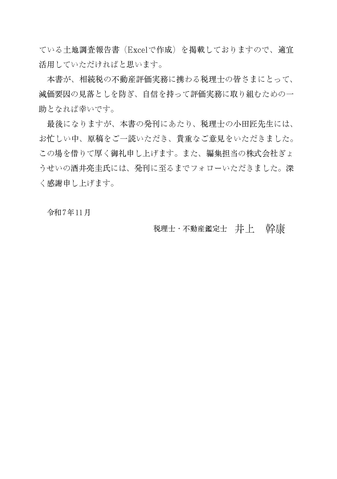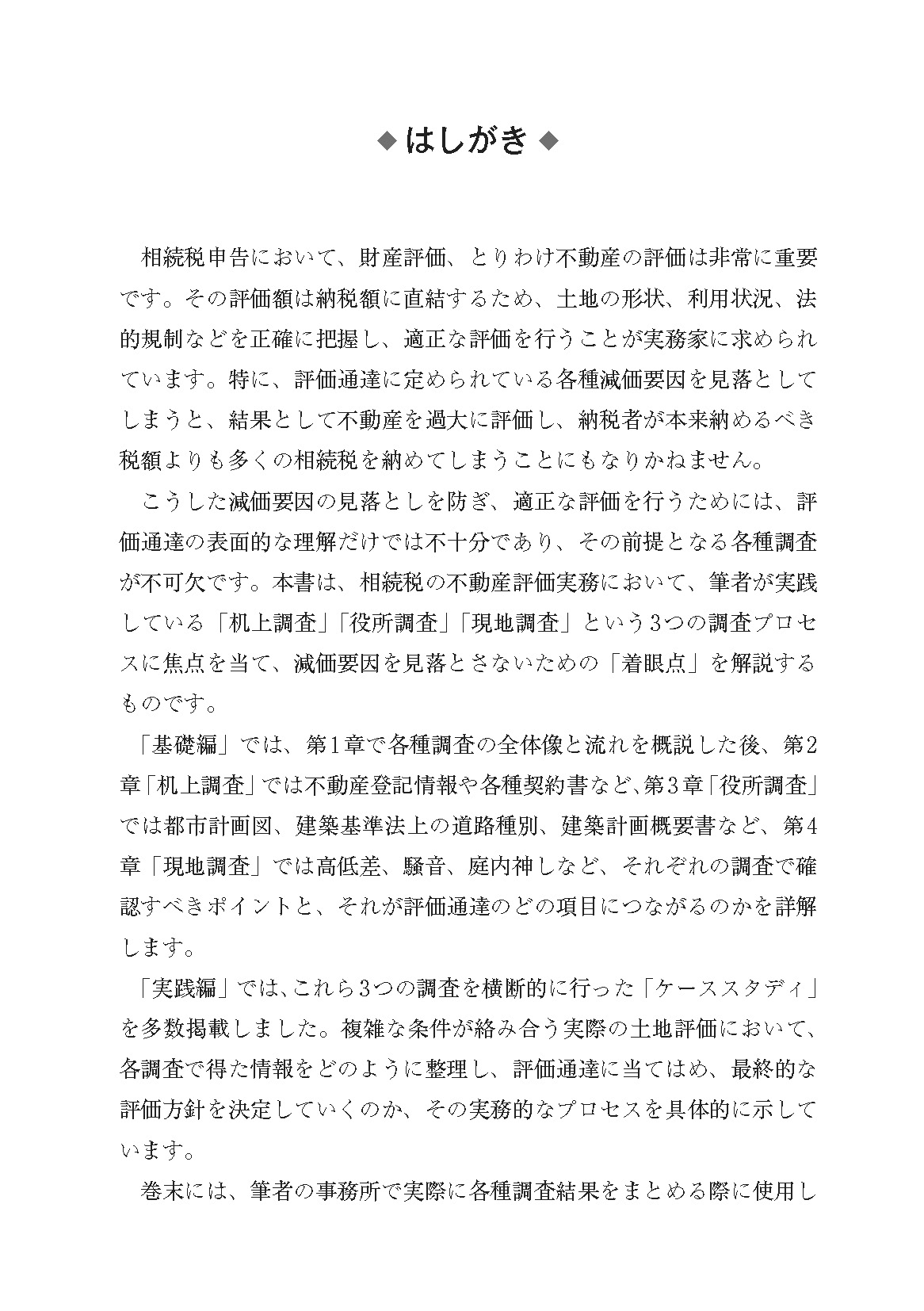 相続税評価の減価要因を見落とさない!ケーススタディ 机上・役所・現地調査の着眼点 出版社:株式会社 ぎょうせい 登録情報 著者: 税理士・不動産鑑定士 井上 幹康/著 出版社: 株式会社 ぎょうせい ISBN: 978-4-324-11590-9 発刊日: 2025-12-22 定価 ¥2,860 (税込) 1 2 3 4 5 6 7 8 9 10 11 12 13 14 15 16 17 18 19 20 21 22 23 24 25 26 27 28 29 30 31 32 33 34 35 36 37 38 39 40 42 43 44 45 46 47 48 49 50 51 52 53 54 55 56 57 58 59 60 61 62 63 64 65 66 67 68 69 70 カートに入れる 商品の紹介 不動産調査の確認ポイントを押さえ、過大評価のリスクを下げる!相続税の対象者が増える中で、不動産の相続税評価額を正しく計算するためには、机上での各種資料の確認だけでは不十分で、役所や現地に赴き、調査確認をすることが求められます。なぜなら、役所でしか得られない情報や現地でしか確認できない事項があり、それらは場合によっては不動産の価値を低下させる減価要因にもなります。減価要因を見落とし、評価をしてしまうと過大評価(相続税の払い過ぎ)につながり、受任をした税理士が責任を問われることも考えられます。つまり、机上・役所・現地で不動産を多角的に調査し、正しく評価をするスキルが税理士には必須となり、それらを解決するために本書を発刊いたしました。【本書の特長】◆机上・役所・現地調査それぞれのポイントを解説する『基本編』と、著者が実際に行った10の事例をベースにした『実践編~ケーススタディ~』により構成。各種調査のポイントの理解と実際の調査の流れ・確認事項が?めます。◆巻末には、著者が普段使用している調査のチェックリストも掲載しています。<目次>◆基礎編第1章 相続税の不動産評価で求められる各種調査第2章 机上調査1.不動産登記情報2.固定資産税関連資料3.固定資産税路線価等(全国地価マップ)4.建物賃貸借契約書、レントロール等5.土地賃貸借契約書、各種届出書等(土地の無償返還に関する届出書など)6.不動産売買契約書(重要事項説明書含む)7.国土地理院地図(傾斜度の概測)8.増改築やリフォーム、リノベーション等の工事請負契約書や減価償却資産の明細書(固定資産台帳)第3章 役所調査1.都市計画図2.都市計画道路計画線の図面3.市街化調整区域における開発許可の立地基準(都市計画法34条各号の取扱い)4.土地区画整理事業施行中の宅地の評価とその調査5.建築基準法上の道路種別6.建築計画概要書7.土砂災害ハザードマップ8.土壌汚染地の評価とその調査9.埋蔵文化財包蔵地の評価とその調査第4章 現地調査1.庭内神し2.水路上の橋3.高圧線4.マンションの現地立て看板5.セットバックの有無6.道路との高低差7.鉄道騒音8.墓地◆実践編ケース1 道路面と高低差のない部分と高低差のある部分がある二方路の宅地ケース2 賃貸アパートと隣接する駐車場の敷地ケース3 指定容積率が同じ2つの用途地域にまたがっている分譲マンションケース4 2項道路沿いで私道負担のある宅地ケース5 開発許可制度による公園状空地と総合設計制度による公開空地があるタワーマンションケース6 都市計画道路の一部区間廃止により都市計画道路予定地ではなくなった宅地ケース7 倍率地域(都市計画区域外)に所在する別荘地ケース8 登記地積と課税地積が異なる倍率地域の宅地ケース9 相続開始後に売却した大きな霊園に近接する戸建住宅地ケース10 接道義務を満たさない路地状敷地 商品のキャンセル及び返品について ご注文が確定してからのキャンセル及び商品到着後の返品は原則不可とさせていただいております。 クーポンの利用忘れや注文の間違いには十分ご注意ください。 落丁・破損等があった場合については、各書籍の出版社までご連絡ください。 お支払い商品の・発送方法について 購入された書籍は、出版社ごとに請求書を同封して発送いたします。 異なる出版社の書籍を複数同時に購入された場合は、それぞれの出版社から別々の荷物で発送されます。 代金のお支払いは出版社ごとの請求書にてそれぞれお支払いください。