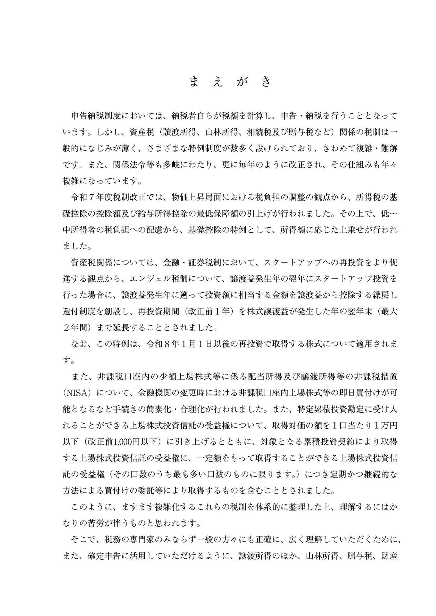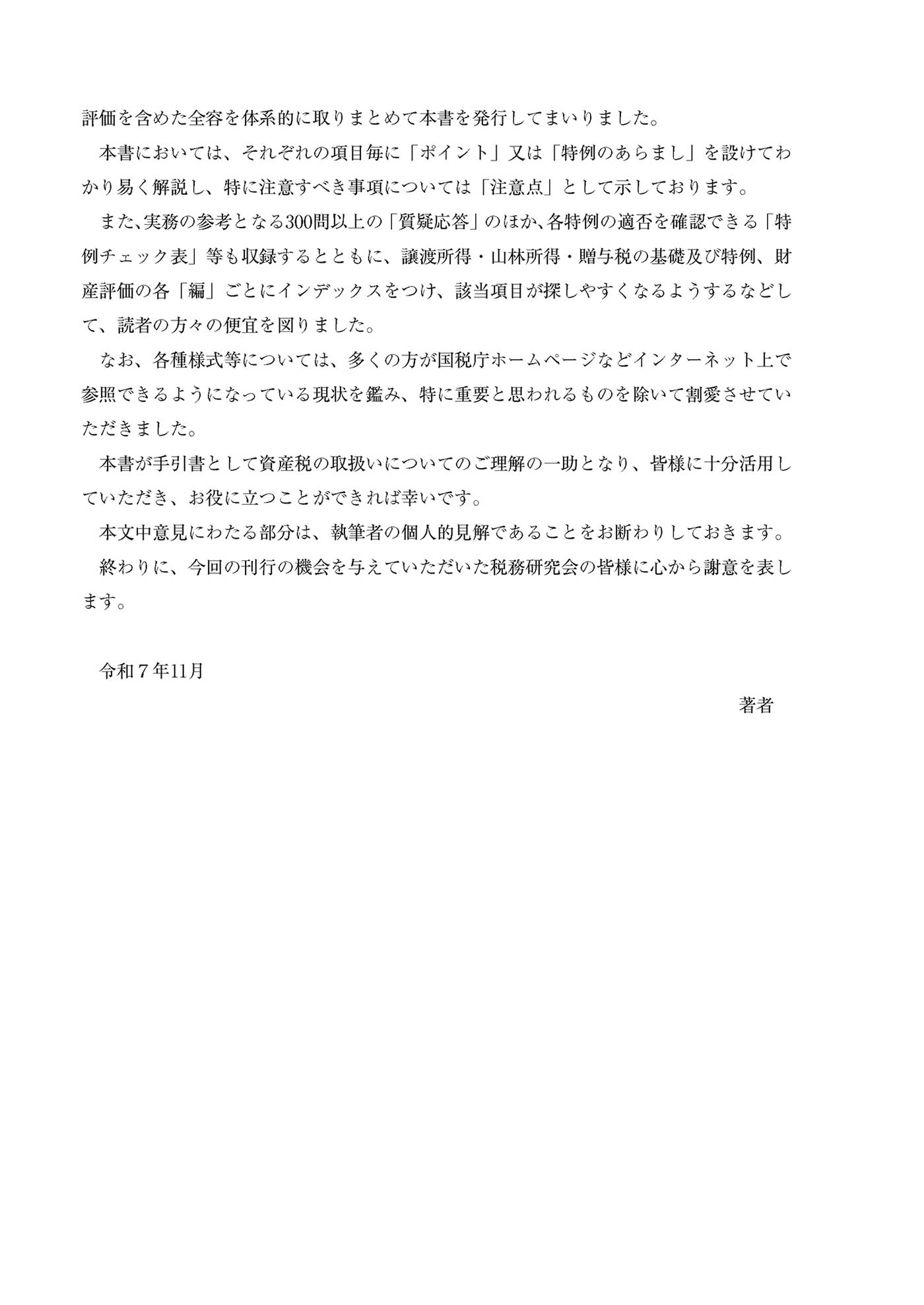 令和8年3月申告用 資産税 申告の手引 出版社:株式会社 税務研究会 登録情報 著者: 前川晶 間瀬暢宏 共著 出版社: 株式会社 税務研究会 ISBN: 978-4-7931-2913-1 発刊日: 2025-12-10 定価 ¥4,290 (税込) 1 2 3 4 5 6 7 8 9 10 11 12 13 14 15 16 17 18 19 20 21 22 23 24 25 26 27 28 29 30 31 32 33 34 35 36 37 38 39 40 42 43 44 45 46 47 48 49 50 51 52 53 54 55 56 57 58 59 60 61 62 63 64 65 66 67 68 69 70 カートに入れる 商品の紹介 ○資産税関係の税制は関係法令が多岐にわたり、様々な特例制度が設けられています。それに加え改正が毎年のように行われ、仕組みは複雑・難解です。本書では譲渡所得等の申告に関連する基本的事項及び特例について、正しく理解できるように整理しながら解説しました。○特例のあらましや改正のポイント、注意点、特例の要否が確認できる「特例チェック表」に加え、具体的な質疑応答を300問以上掲載しています。○今回の改訂では、エンジェル税制の拡充や、NISA制度における手続きの簡素化・合理化、特定累積投資勘定に受け入れることができる上場株式投資信託の受益権の取得対価の額の引き上げと、対象となる累積投資契約により取得する上場株式投資信託の受益権の拡充、等の留意点について言及しています。 商品のキャンセル及び返品について ご注文が確定してからのキャンセル及び商品到着後の返品は原則不可とさせていただいております。 クーポンの利用忘れや注文の間違いには十分ご注意ください。 落丁・破損等があった場合については、各書籍の出版社までご連絡ください。 お支払い商品の・発送方法について 購入された書籍は、出版社ごとに請求書を同封して発送いたします。 異なる出版社の書籍を複数同時に購入された場合は、それぞれの出版社から別々の荷物で発送されます。 代金のお支払いは出版社ごとの請求書にてそれぞれお支払いください。