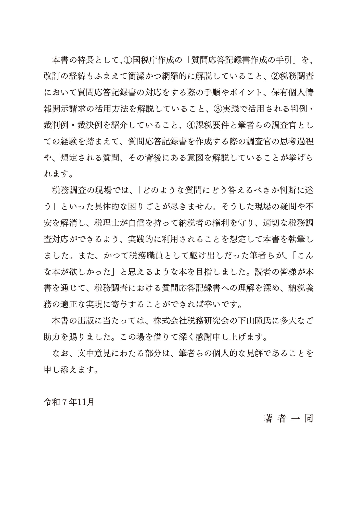 税務調査の現場で役立つ!質問応答記録書のポイントと税理士の対応策 出版社:株式会社 税務研究会 登録情報 著者: 柳谷憲司 石野裕之 平岡良太 清水太一 川口誠 市田佳祐 共著 出版社: 株式会社 税務研究会 ISBN: 978-4-7931-2905-6 発刊日: 2025-12-18 定価 ¥3,300 (税込) 1 2 3 4 5 6 7 8 9 10 11 12 13 14 15 16 17 18 19 20 21 22 23 24 25 26 27 28 29 30 31 32 33 34 35 36 37 38 39 40 42 43 44 45 46 47 48 49 50 51 52 53 54 55 56 57 58 59 60 61 62 63 64 65 66 67 68 69 70 カートに入れる 商品の紹介 税務調査の中で、納税者が保存している帳簿や領収書等の資料のみでは課税要件事実の認定が困難であることが少なくありません。納税者しか知り得ない認識や意図といったものを証拠化し、それにより事実を認定しなければ課税要件を立証できない場合に作成されるものが「質問応答記録書」になります。質問応答記録書は、納税者の供述内容が公式な証拠として残る極めて重要な行政文書であり、その作成一つがその後の税務判断や法的対応に大きな影響を及ぼすことがあります。本書では、質問応答記録書が作成される場面で、税理士はどのような対応をするべきかを、国税OBの6名の著者が「調査をする側」と「調査を受ける側」双方の視点から得た知見をもとに解説しています。① 国税庁が作成している「質問応答記録書作成の手引」について、改訂の経緯を踏まえて簡潔かつ網羅的に解説しています。② 税務調査において質問応答記録書の対応をする際の手順やポイント、保有個人情報開示請求の活用方法を解説しています。③ 実践で活用される判例・裁判例・裁決例を紹介しています。④ 課税要件と筆者らの調査官としての経験を踏まえて、質問応答記録書を作成する際の調査官の思考過程や、想定される質問、その背後にある意図を解説しています。 商品のキャンセル及び返品について ご注文が確定してからのキャンセル及び商品到着後の返品は原則不可とさせていただいております。 クーポンの利用忘れや注文の間違いには十分ご注意ください。 落丁・破損等があった場合については、各書籍の出版社までご連絡ください。 お支払い商品の・発送方法について 購入された書籍は、出版社ごとに請求書を同封して発送いたします。 異なる出版社の書籍を複数同時に購入された場合は、それぞれの出版社から別々の荷物で発送されます。 代金のお支払いは出版社ごとの請求書にてそれぞれお支払いください。