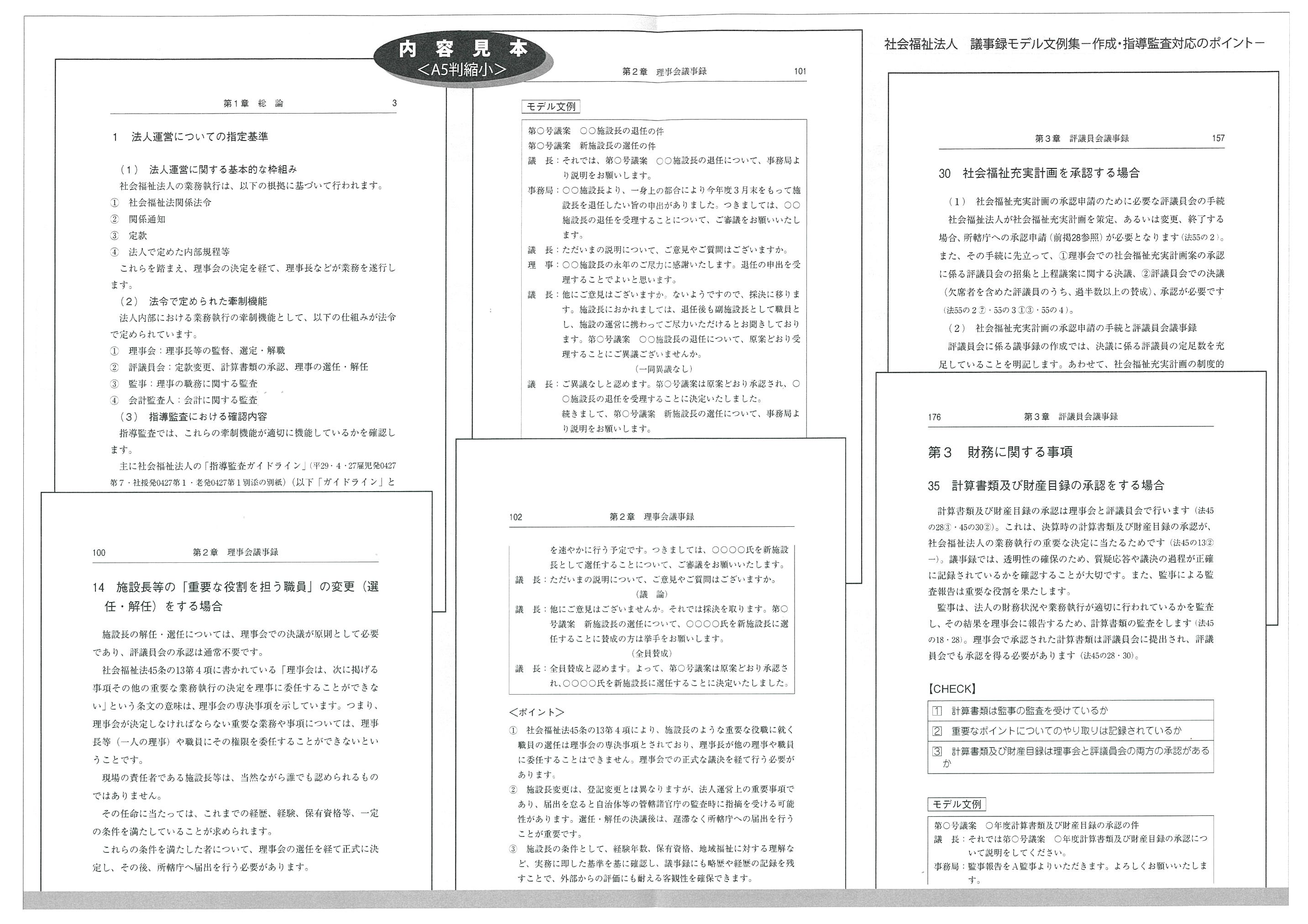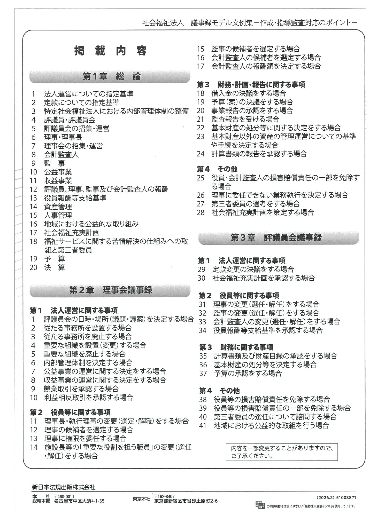 社会福祉法人 議事録モデル文例集-作成・指導監査対応のポイント- 出版社:新日本法規出版 株式会社 登録情報 著者: 共編 福岡新司(一般社団法人SOWET理事長) 船山敏一(社会福祉法人藤沢ひまわり常務理事、総合施設長) 出版社: 新日本法規出版 株式会社 ISBN: 978-4-7882-9594-0 発刊日: 2026-03-16 発刊後の商品発送となります。 定価 ¥3,520 (税込) 1 2 3 4 5 6 7 8 9 10 11 12 13 14 15 16 17 18 19 20 21 22 23 24 25 26 27 28 29 30 31 32 33 34 35 36 37 38 39 40 42 43 44 45 46 47 48 49 50 51 52 53 54 55 56 57 58 59 60 61 62 63 64 65 66 67 68 69 70 カートに入れる 商品の紹介 円滑な法人運営のために!◆理事会及び評議員会の様々な議案を取り上げ、決議のチェック事項と議事録のモデル文例を掲載◆指導監査で求められる「適正な法人運営」の根拠資料となる議事録を作成・確認する際の要点を整理◆社会福祉法人のみならず、法人を支援する税理士・司法書士等の専門家や自治体関係者も活用できる一冊 商品のキャンセル及び返品について ご注文が確定してからのキャンセル及び商品到着後の返品は原則不可とさせていただいております。 クーポンの利用忘れや注文の間違いには十分ご注意ください。 落丁・破損等があった場合については、各書籍の出版社までご連絡ください。 お支払い商品の・発送方法について 購入された書籍は、出版社ごとに請求書を同封して発送いたします。 異なる出版社の書籍を複数同時に購入された場合は、それぞれの出版社から別々の荷物で発送されます。 代金のお支払いは出版社ごとの請求書にてそれぞれお支払いください。