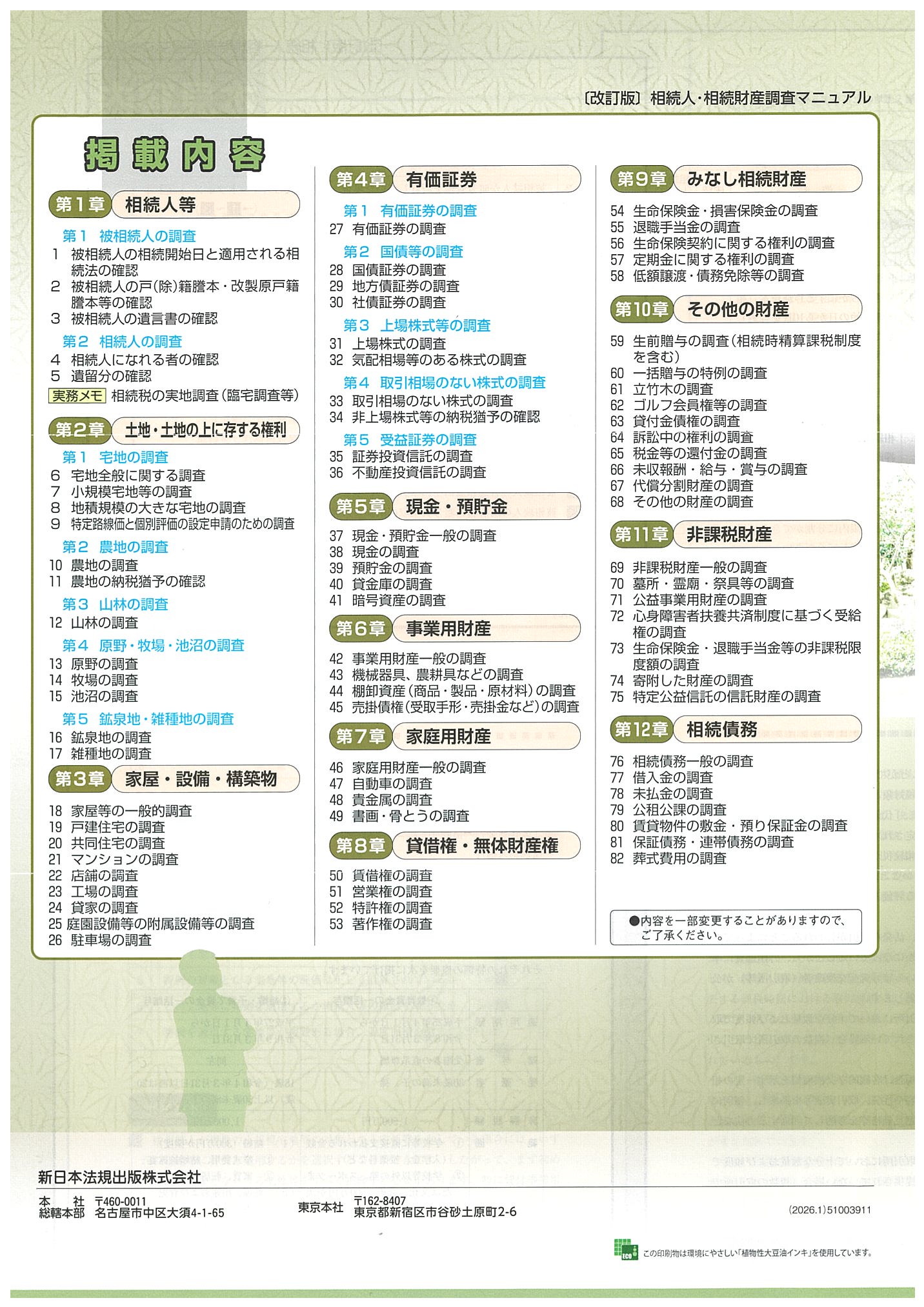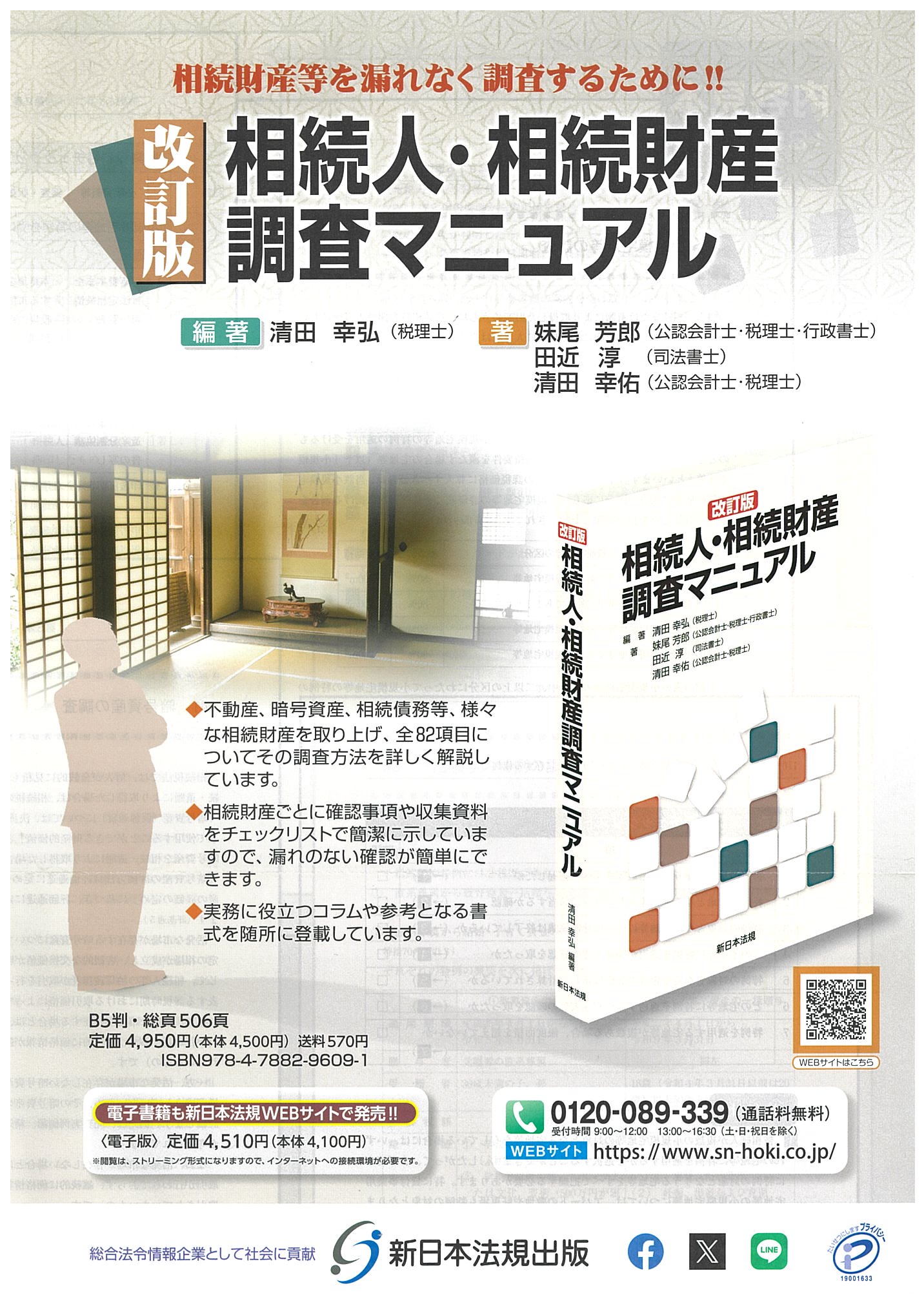 〔改訂版〕相続人・相続財産調査マニュアル 出版社:新日本法規出版 株式会社 登録情報 著者: 編著 清田幸弘(税理士) 著 妹尾芳郎(公認会計士・税理士・行政書士)田近淳(司法書士)清田幸佑(公認会計士・税理士) 出版社: 新日本法規出版 株式会社 ISBN: 978-4-7882-9609-1 発刊日: 2026-02-10 定価 ¥4,950 (税込) 1 2 3 4 5 6 7 8 9 10 11 12 13 14 15 16 17 18 19 20 21 22 23 24 25 26 27 28 29 30 31 32 33 34 35 36 37 38 39 40 42 43 44 45 46 47 48 49 50 51 52 53 54 55 56 57 58 59 60 61 62 63 64 65 66 67 68 69 70 カートに入れる 商品の紹介 相続財産等を漏れなく調査するために!!◆不動産、暗号資産、相続債務等、様々な相続財産を取り上げ、全82項目についてその調査方法を詳しく解説しています。◆相続財産ごとに確認事項や収集資料をチェックリストで簡潔に示していますので、漏れのない確認が簡単にできます。◆実務に役立つコラムや参考となる書式を随所に登載しています。 商品のキャンセル及び返品について ご注文が確定してからのキャンセル及び商品到着後の返品は原則不可とさせていただいております。 クーポンの利用忘れや注文の間違いには十分ご注意ください。 落丁・破損等があった場合については、各書籍の出版社までご連絡ください。 お支払い商品の・発送方法について 購入された書籍は、出版社ごとに請求書を同封して発送いたします。 異なる出版社の書籍を複数同時に購入された場合は、それぞれの出版社から別々の荷物で発送されます。 代金のお支払いは出版社ごとの請求書にてそれぞれお支払いください。