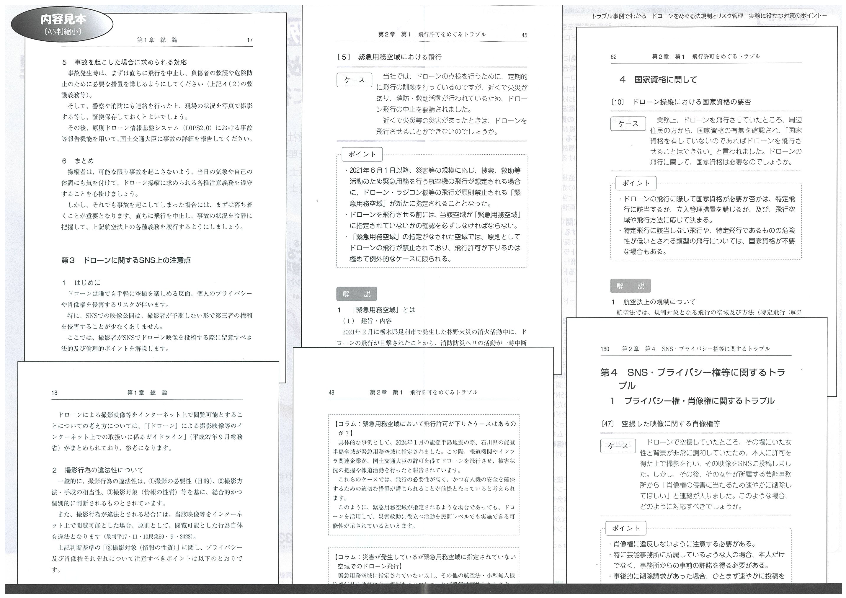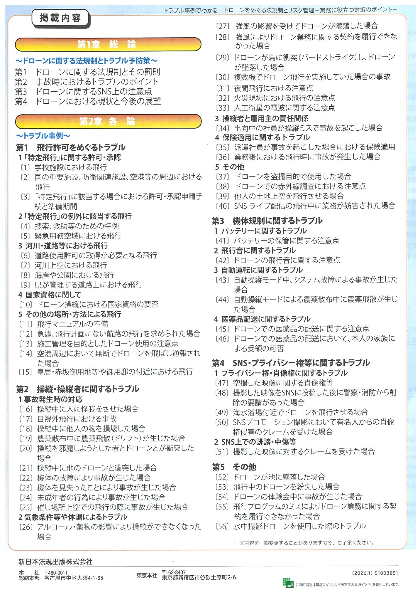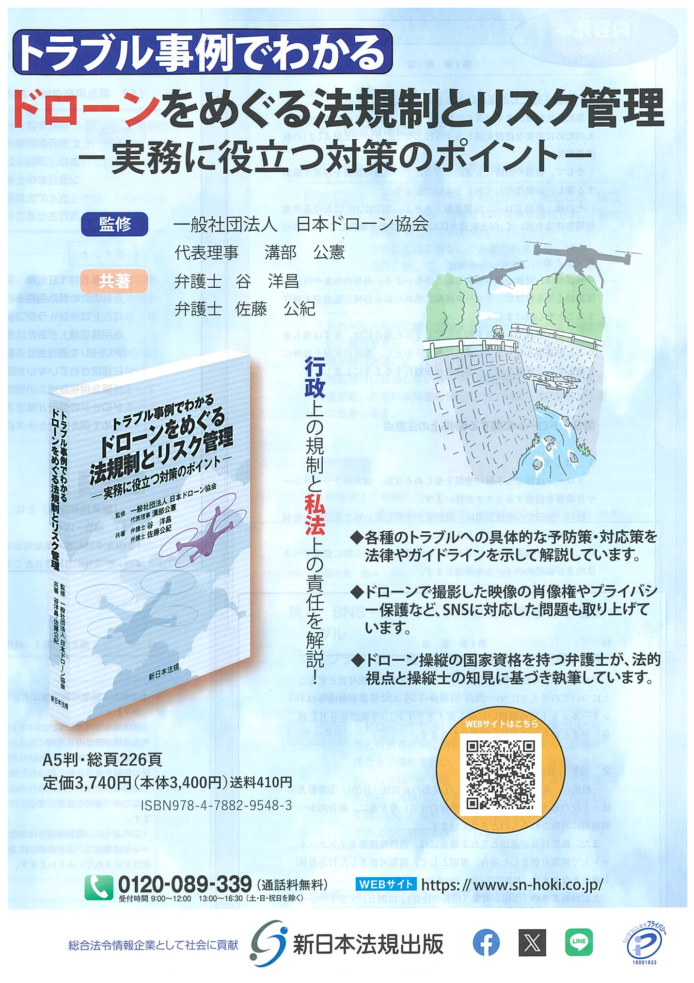 トラブル事例でわかる ドローンをめぐる法規制とリスク管理-実務に役立つ対策のポイント- 出版社:新日本法規出版 株式会社 登録情報 著者: 監修 一般社団法人日本ドローン協会 代表理事溝部公憲 共著 弁護士谷洋昌 弁護士佐藤公紀 出版社: 新日本法規出版 株式会社 ISBN: 978-4-7882-9548-3 発刊日: 2026-02-09 定価 ¥3,740 (税込) 1 2 3 4 5 6 7 8 9 10 11 12 13 14 15 16 17 18 19 20 21 22 23 24 25 26 27 28 29 30 31 32 33 34 35 36 37 38 39 40 42 43 44 45 46 47 48 49 50 51 52 53 54 55 56 57 58 59 60 61 62 63 64 65 66 67 68 69 70 カートに入れる 商品の紹介 行政上の規制と私法上の責任を解説!◆各種のトラブルへの具体的な予防策・対応策を法律やガイドラインを示して解説しています。◆ドローンで撮影した映像の肖像権やプライバシー保護など、SNSに対応した問題も取り上げています。◆ドローン操縦の国家資格を持つ弁護士が、法的視点と操縦士の知見に基づき執筆しています。 商品のキャンセル及び返品について ご注文が確定してからのキャンセル及び商品到着後の返品は原則不可とさせていただいております。 クーポンの利用忘れや注文の間違いには十分ご注意ください。 落丁・破損等があった場合については、各書籍の出版社までご連絡ください。 お支払い商品の・発送方法について 購入された書籍は、出版社ごとに請求書を同封して発送いたします。 異なる出版社の書籍を複数同時に購入された場合は、それぞれの出版社から別々の荷物で発送されます。 代金のお支払いは出版社ごとの請求書にてそれぞれお支払いください。